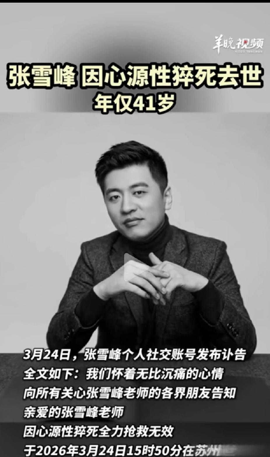 41岁的张雪峰因心源性猝死突然离世,太意外太遗憾了,有点难以接受,经常看他的直播切片,从没想过他这么年轻就走了,那个直播间里侃侃而谈、指点迷津的张老师就这么走了,不过,江湖上永远有你的传说,你想成为一代学生和家长们的记忆,也做到了,愿一路走好!!
