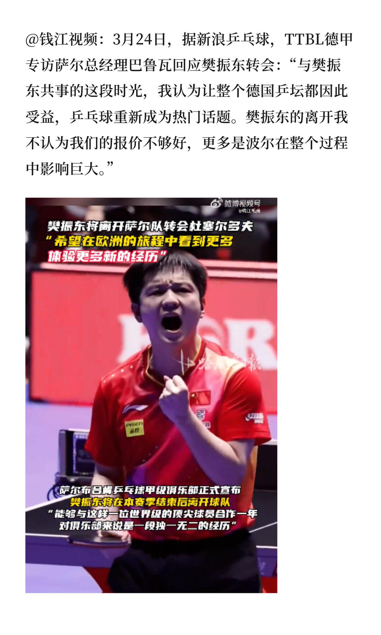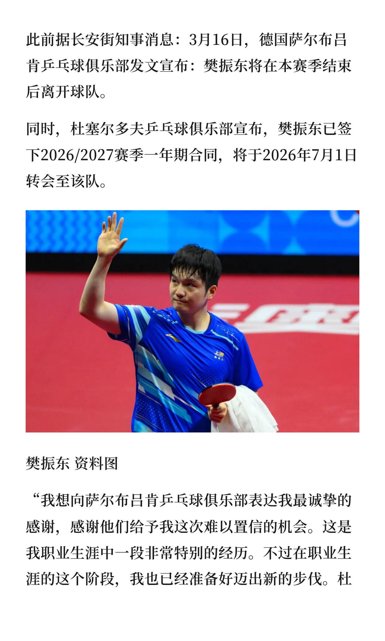 萨尔俱乐部终于回应樊振东离开,薪资不是不够好,杜塞是大城市,各方面完备! 他自己