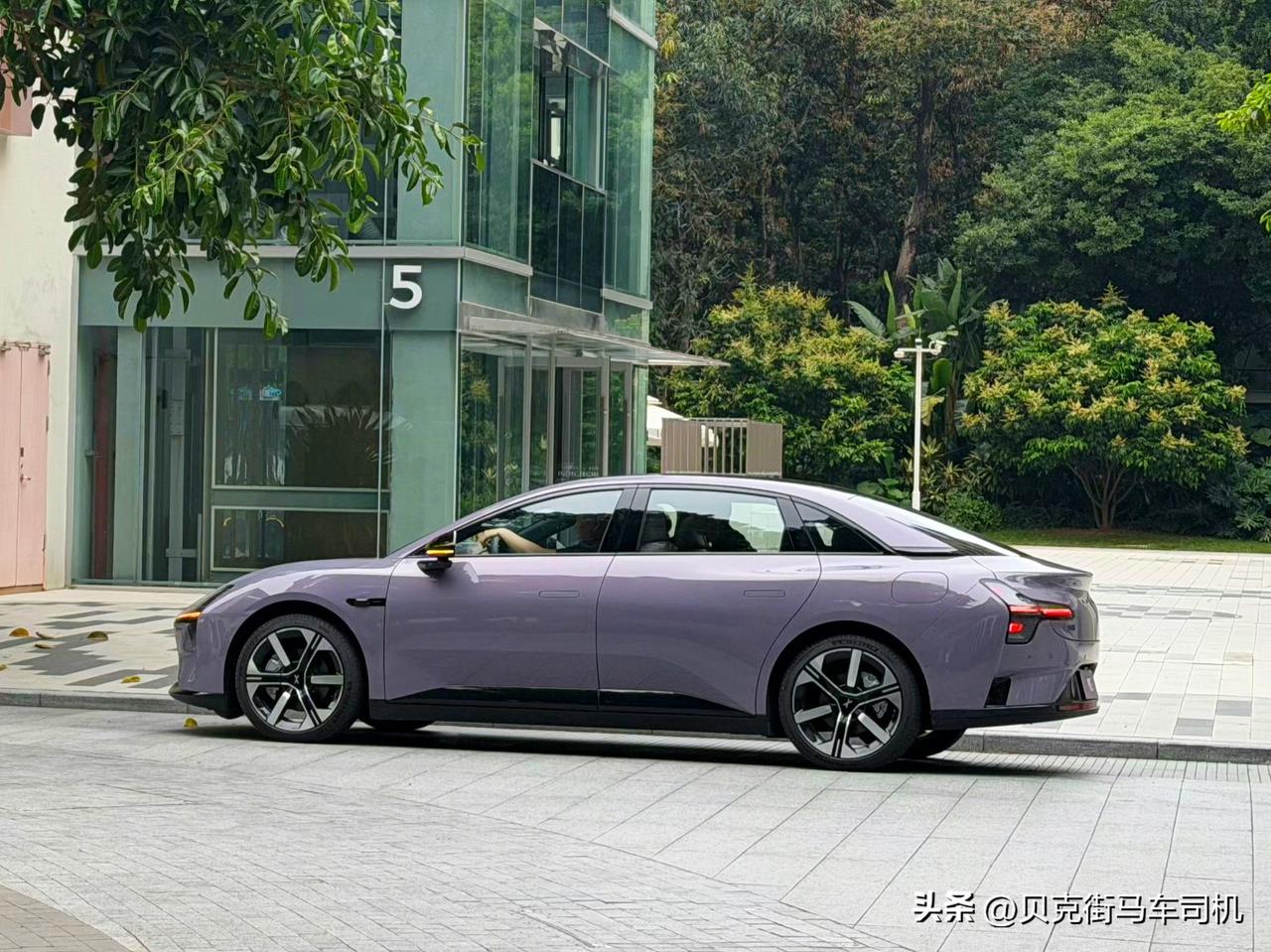 在小鹏众多车型中,卖最便宜的mona03设计反而我是觉得是最漂亮的。 这个角度正好把紫mona和卡宴摆一块儿,大轮子的视觉效果一下就出来了。新车漆面特别亮,光影质感很抓人。虽然L113短,但前悬也短,轮高比到位,溜背加车门下方的黑色饰板,整体又低趴又流畅。 当年主打低风阻,但不像奔驰EQS那样为了风阻牺牲传统审美,mona两样都顾上了,确实巧。