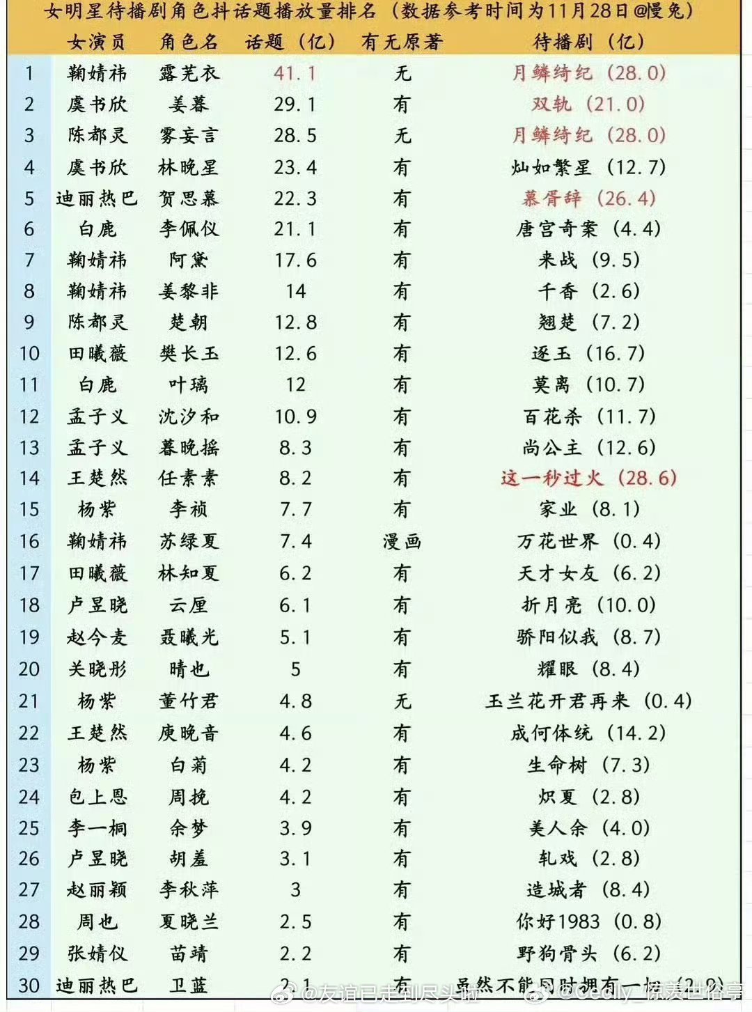 🎼🍠女演员待播角色热度榜,《月鳞绮纪》鞠婧祎,陈都灵都位列前三