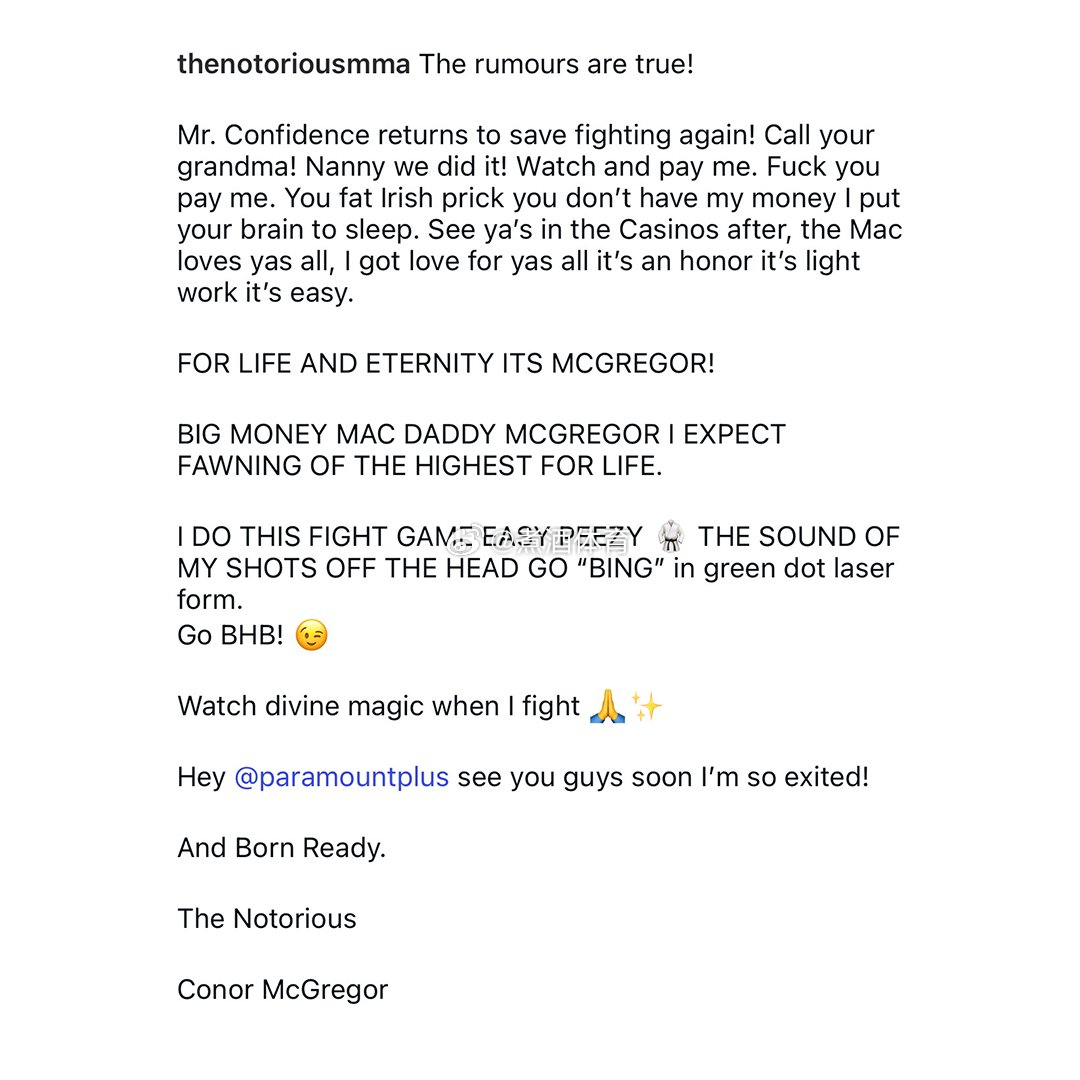 “传闻属实!‘自信先生’将再度回归,拯救格斗界!嘿,派拉蒙(Paramount),很快就能见到你们了,我太兴奋了!”