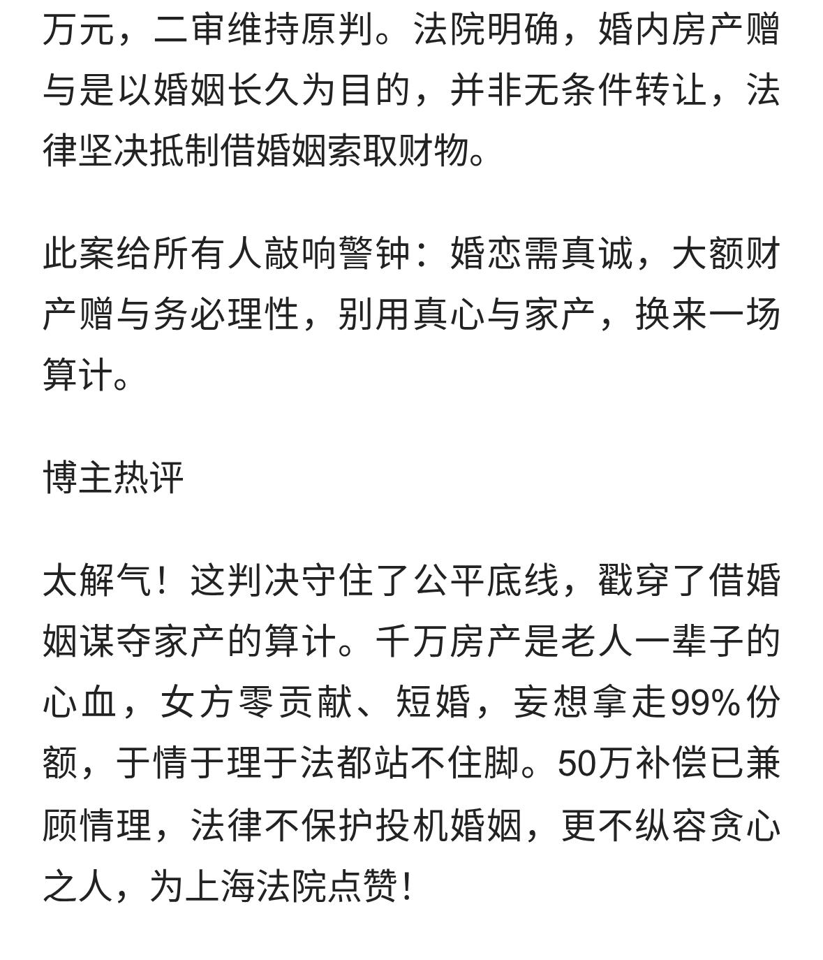“太解气了!”上海一小伙与离异带娃女相识一个月后闪婚。婚后女方以孩子要落户上海上学为由,怂恿他把近千万房产99%份额转到自己名下。谁知份额刚转没几个月,女方就提离婚要分走房子!最终法院判决全网叫好! 整件事的来龙去脉,没有半点虚构,全部基于上海当地法院审理的真实判例,每一个环节都经得起推敲。 这位上海小伙,名下有一套婚前全款购置的房产,市场价值接近千万元,这是他多年打拼攒下的核心资产,属于实打实的婚前个人财产。 机缘巧合下,他认识了一位离异带娃的女性,两人相处投缘,仅仅相识一个月就敲定婚事,火速办理了结婚登记,也就是大家常说的闪婚。 刚步入婚姻时,小伙满心都是好好过日子的念头,对待女方和孩子都格外上心,想着组建了新家庭,就要彼此包容、相互扶持。 婚后没多久,女方就开始频繁提起孩子的上学问题,反复强调只有落户上海,孩子才能读公办优质学校,而落户的关键,就是要把房产份额转到自己名下。 女方一遍遍软磨硬泡,把孩子上学的理由说得合情合理,不断怂恿小伙将这套近千万房产99%的份额转让给自己,只给小伙留1%的象征性份额。 小伙一开始也有过顾虑,毕竟是价值千万的房产,事关自己半辈子的心血。可架不住女方天天劝说,再加上他一心想维系家庭和睦,也真心想帮孩子解决上学难题,最终心软答应了这个要求。 紧接着,两人配合办理了房屋产权变更手续,房产证上正式登记为女方占99%份额,小伙仅占1%。小伙以为,这份退让能换来安稳的家庭生活,却没料到噩梦很快就来了。 产权份额变更完成后,仅仅过了几个月,女方的态度就发生了翻天覆地的变化。她不再提孩子落户上学的事,反而频繁挑起家庭矛盾,对小伙百般挑剔,日常相处处处充满抵触。 没过多久,女方直接向法院提起离婚诉讼,同时拿出变更后的房产证,主张这套房产99%的份额归自己所有,要求离婚时彻底分割走这套千万房产。 直到这时,小伙才彻底醒悟,自己从一开始就掉进了对方设下的圈套。所谓的孩子落户上学,不过是哄骗他转让房产的借口,女方从始至终的目的,就是觊觎他的婚前房产,压根没有真心和他长久过日子的想法。 案件庭审阶段,女方死死咬住房产登记的份额不放,坚持要求按登记比例分割财产,看似占尽了纸面优势。可法院并没有只看产权登记,而是结合全部案情事实,做出了公正且严谨的审理。 法院首先明确,这套房产是小伙婚前全款购买,属于法定的婚前个人财产,并非夫妻婚后共同创造的财富。 随后法院认定,小伙转让99%房产份额的行为,属于以婚姻长久稳定存续为前提的附条件赠与,并不是无条件的无偿赠送。他做出这份退让,核心是为了维系婚姻、照顾家庭,而非平白无故将大额财产赠予对方。 而女方在完成产权变更后,短短数月就主动起诉离婚,足以证明其并非以共同生活为目的,而是借助婚姻关系恶意谋取他人婚前大额财产,这种行为违背了诚信原则,也触碰了法律的公平底线。 基于这些核心事实,上海长宁法院最终作出一审判决,这套近千万房产依旧归小伙个人所有,女方需配合办理产权变更登记,将份额恢复原状。 考虑到双方短暂的婚姻关系,法院仅判决小伙向女方支付数万元房屋折价款,彻底驳回了女方分割99%房产份额的诉求。 女方不服判决提起上诉,二审法院经过核查,依旧维持原判,没有给女方任何恶意侵占财产的空间。 这份判决之所以能让全网拍手叫好,核心原因就是它没有被纸面的产权登记束缚,而是守住了法律的本质公平。 法律从来不会保护借婚姻敛财的行为,更不会无视婚前财产的合法归属。不管是男方还是女方,借助婚姻关系算计对方的个人财产,妄图走捷径获取巨额财富,最终都不会得到法律的支持。 这件事也给所有身处婚恋中的人提了一个醒,闪婚本身就存在诸多未知风险,面对大额财产处置一定要保持理智。 房产、存款这类关乎自身核心利益的财产,千万不要被一时的感情冲昏头脑,更不能轻信对方的片面说辞随意转让、过户。 涉及子女落户、上学等问题,完全可以通过合法合规的正规途径解决,没必要拿自己的毕生心血做赌注。 婚恋的核心永远是真心换真心,婚姻从来都不是谋取私利的工具。那些带着算计靠近的关系,哪怕暂时占到了小便宜,最终也会被法律戳破谎言,落得一场空。 这场公正的判决,既帮无辜的小伙守住了财产,也给所有心存歪念的人敲响了警钟,踏踏实实过日子、真心实意待他人,才是婚恋最该有的样子。