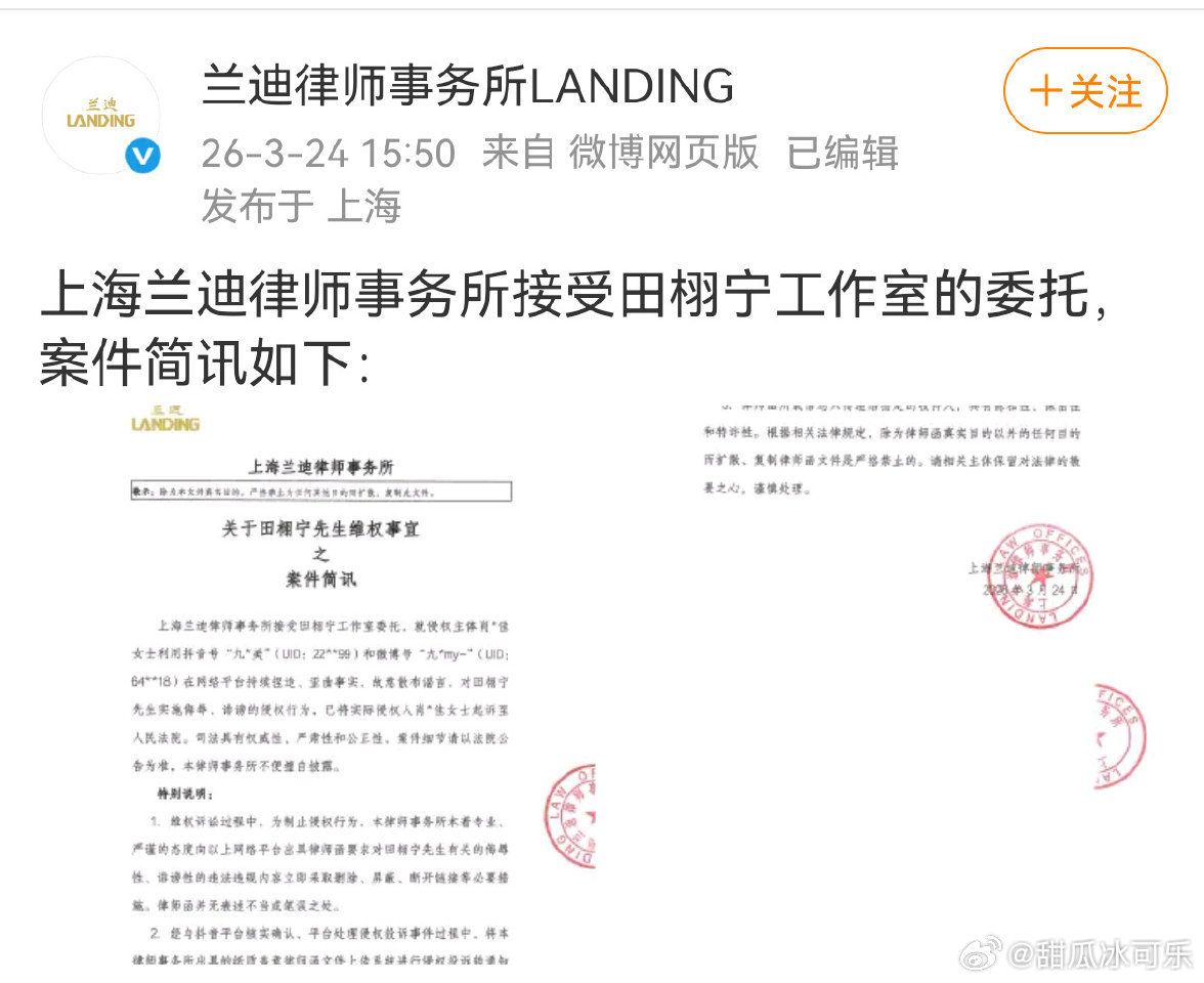 律所发布田栩宁维权案件简讯拒绝法律娱乐化,请保持对法律的敬畏之心!支持田栩宁维权