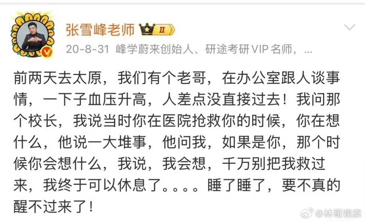 张雪峰微博曾5次提及猝死看了张雪峰老师以前的微博,才发现他以前说过好多次自己会猝死的话,言出法随,大s也是这样……说不吉利的话的人有没有可能就是一直在生死边缘,但是他们又有不能停下来的理由,所以只能说说,自己的身体自己最清楚。张雪峰团队老师整夜未眠嘴唇发紫 心脏不好