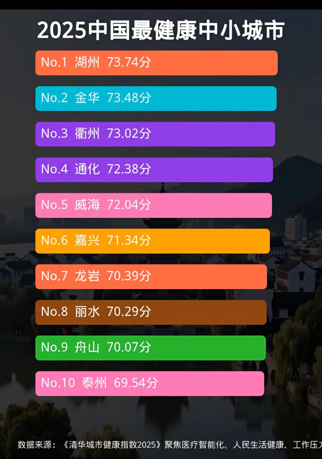 图表展示评选出的“2025中国最健康中小城市”前10名榜单,榜单前三名均被浙江省城市包揽:湖州以73.74分位居榜首,金华(73.48分)紧随其后,衢州(73.02分)位列第三,显示出浙江在中小城市健康发展方面的整体优势。第四至第十名依次为通化(吉林)、威海(山东)、嘉兴(浙江)、龙岩(福建)、丽水(浙江)、舟山(浙江)和泰州(江苏),体现了区域发展的相对均衡。从评分分布来看,头部城市得分高度集中,前四名差距不足1.5分,竞争激烈,而第十名泰州(69.54分)与前三名相差约4分,存在一定梯度。数据来源聚焦于“医疗智能化、人民生活健康、工作压力”三大维度,暗示这些城市在上述领域表现突出。值得注意的是,上榜城市多为生态宜居、节奏舒缓的二三线城市,说明“健康城市”不仅依赖经济指标,更与生态环境、民生服务和压力管理密切相关。浙江多城入选,也反映出其在共同富裕与健康城市建设上的先行探索成效显著。