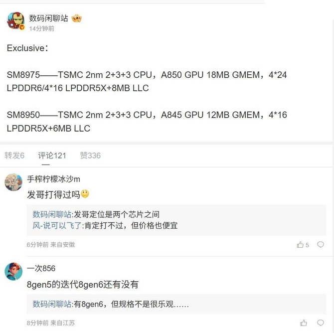 3月25日消息,高通下一代骁龙8至尊版旗舰处理器的信息曝光,博主@数码闲聊站今日爆料了SM8950和SM8975两个版本的配置:SM8975——TSMC2nm2+3+3CPU,A850GPU18MBGMEM,424LPDDR6/416LPDDR5X+8MBLLCSM8950——TSMC2nm2+3+3CPU,A845GPU12MBGMEM,4*16LPDDR5X+6MBLLC该博主还称“发哥定位是两个芯片之间”,预计是指联发科最新的旗舰处理器天玑9600。博主还确认会有骁龙8Gen6,但规格不是很乐观。注意到,该博主今年2月曾爆料称,高通下代旗舰芯双版本SM8950+SM8975,都是台积电N2p工艺,目前仅SM8975支持LPDDR6+满血GPU+满配缓存。