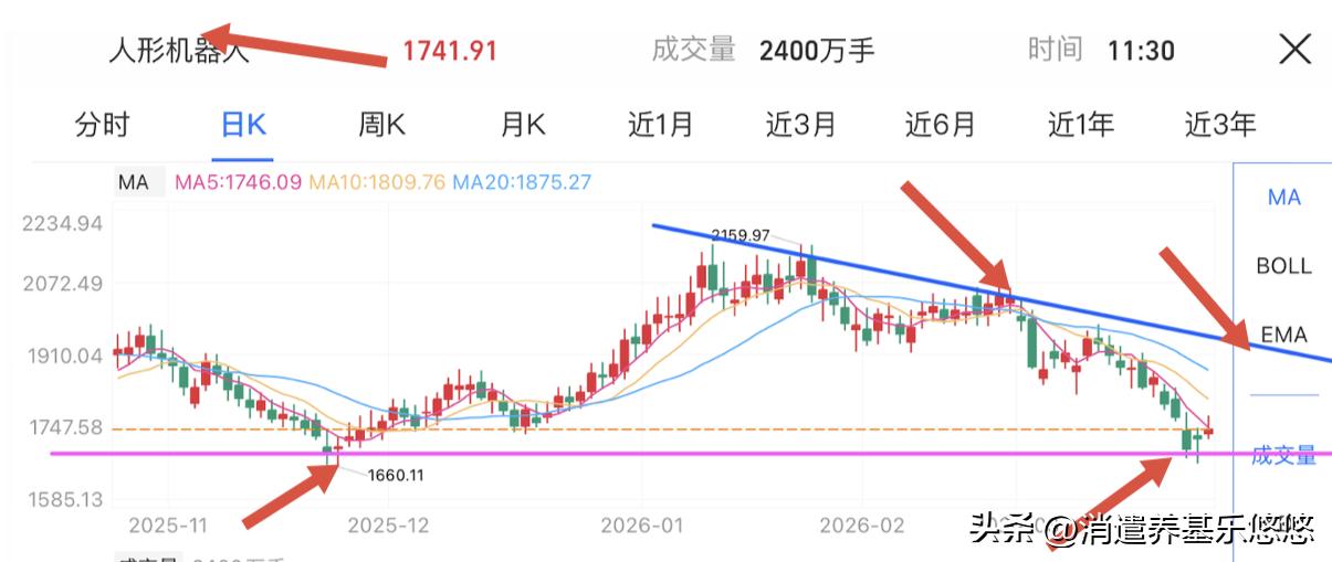 收盘皆大欢喜,连续拉两天,明天估计要洗盘。今天主力资金流入215亿元,比较难得,按规律明天他是流出的。成交额2.2万亿元,比昨天放量968亿元,下午资金流入比前后缩小。 今天是普反行情,cpo通信设备是带头大哥,机构抱团抱的很紧,看来这个板块短期还能做。 电力电网有色金属半导体材料设备表现强势,大胆的可以布局点黄金了。 人形机器人今天有几个涨停板股票,跌的深涨幅猛,这个板块短期看涨了。 表现比较弱的还是大消费白酒医药医疗。卫星产业商业航天也不怎么样,因为它还没有回调到位。 恒生科技指数小双底形态,是上还是下,明天走势是关键。 下图是人形机器人有色金属存储芯片日线走势图,他们都到了下方支撑位,如果这个位置能守住,后市到压力线还有一定的反弹空间,否则就麻烦了。