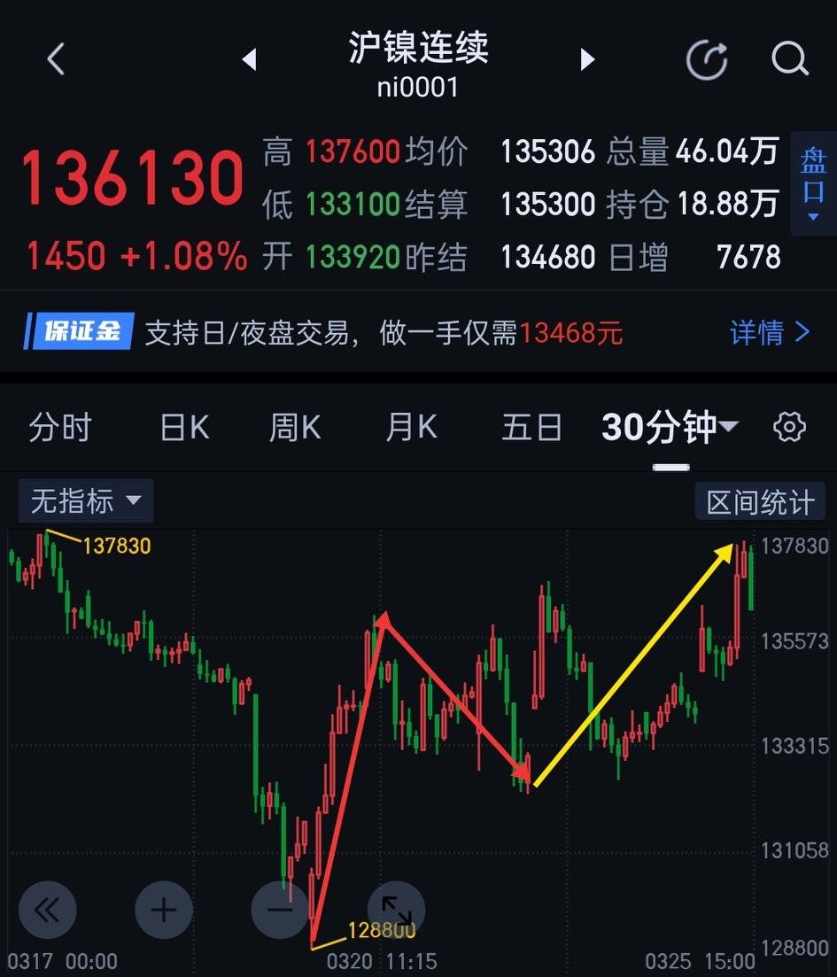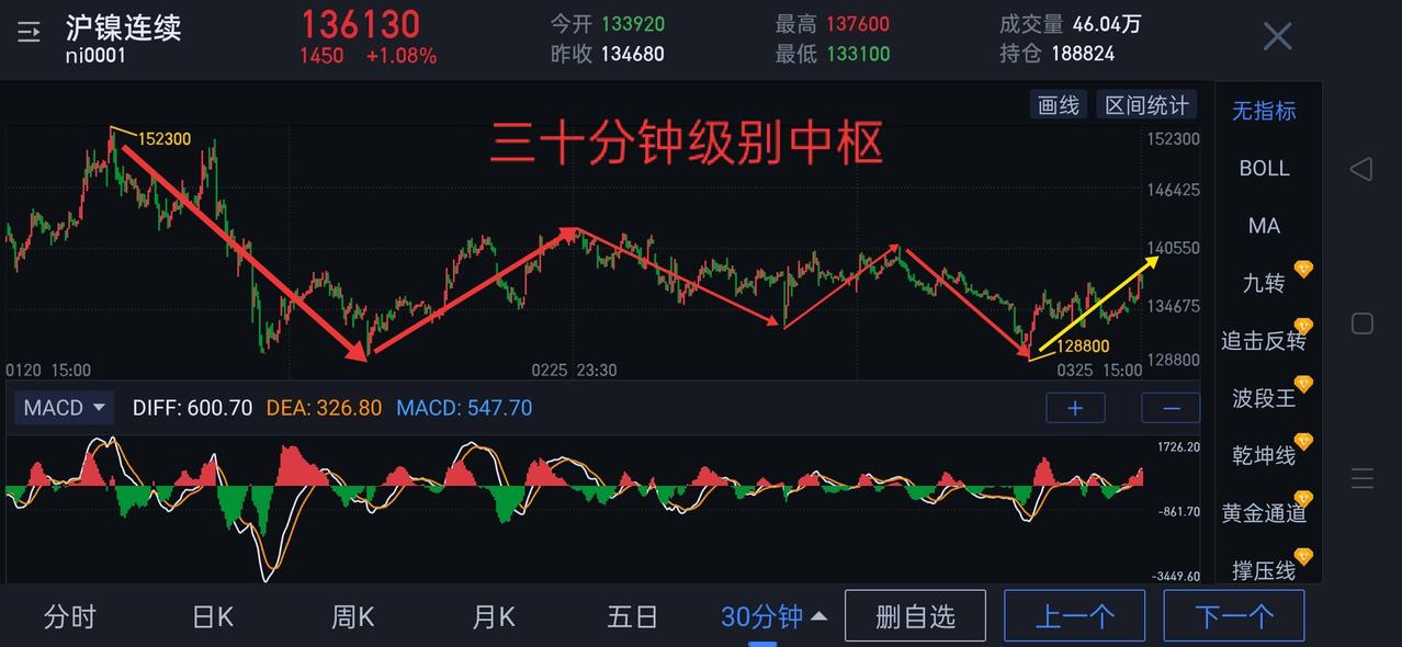 沪镍,多头展现积极一面。 日盘沪镍回踩站稳昨天夜盘关键点位133680。回踩低点形成了图(1)一分钟中枢的三买点。 夜盘沪镍能否有效站稳134590是关键。站稳,将会构成图(1)第二个一分钟中枢,后期的重点是观察一分钟级别的趋势背驰。若134590不能站稳,开始于132160的三十分钟一笔上(图2)将面临结束。 沪镍当下仍处于图(3)三十分钟中枢震荡。如果夜盘能形成一分钟级别的向上趋势,将有助于图(3)黄色线段突破三十分钟中枢的束缚。(图中黄色线段均属于待完成走势)