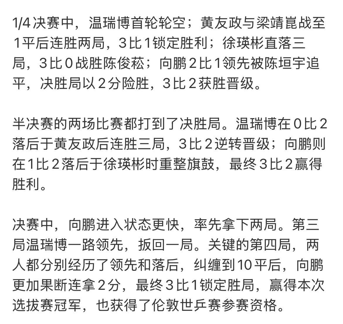 向鹏赢得男队第二次选拔赛冠军,获伦敦世乒赛参赛资格