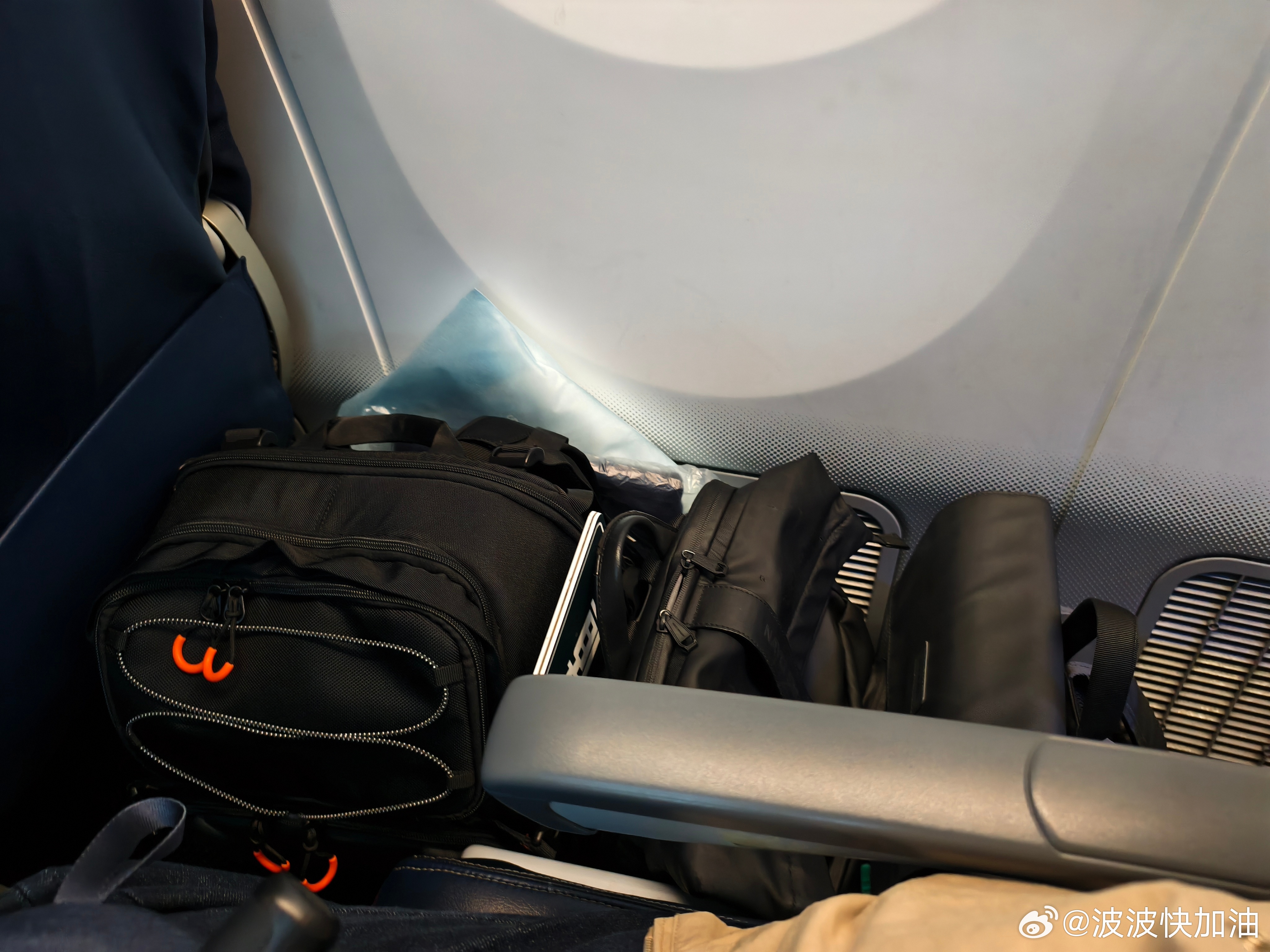 实测波音 787-9 的 55K 位置非常不错,右边空档可以直接放行李。(主要登