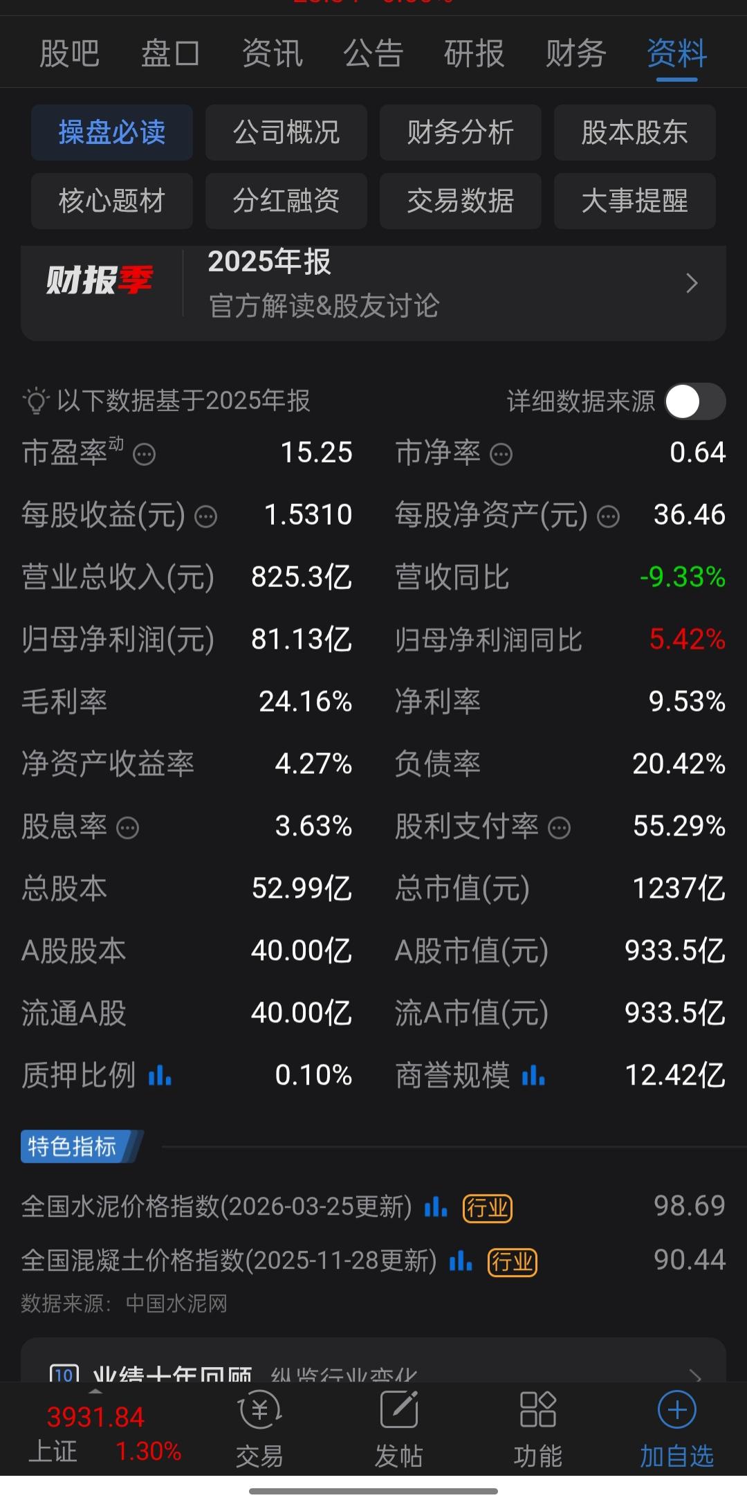 每股23.34元的股价,对应着每股36.46元的净资产、33.04元的未分配利润!看到这样的数据,我第一反应是以为自己眼花了。 跟大家聊聊的这家公司,它是中国水泥业的龙头老大,现在的股价也就23块出头,但是你翻开它的家底看看,真的有点吓人。 先看几个硬指标。根据2025年年报数据,公司的每股净资产高达36.46元,这里面光是每股未分配利润就有33.04元。 啥概念?就是说公司账面上属于股东的、已经赚到手但没分掉的钱,换算成每股都比现在的股价还要高!这还没完,它的每股经营现金流有3.15元,每股资本公积金也有2.02元。手里现金流这么充裕,说明家大业大,真不缺钱。 这是一家资格很老的公司,1997年就成立了,同年发行H股在香港联交所上市,2002年回归A股登陆上交所。在那个中国基础设施刚刚起飞的年代,它一路见证了中国城镇化建设的全过程。 我翻了一下它的历史走势,上市后最猛的一波当属2005年到2007年那轮大牛市。那会儿市场把它当成中国基建黄金时代的代表来炒。 不过,从那之后到现在,将近20年过去了,虽然中间也有起伏,但股价如果用复权看,比起很多消费、医药大白马,这个涨幅在A股里确实只能算中等水平。毕竟盘子太大了,想要像小票那样动不动翻几倍,确实难。 再看业绩。公司2025年实现营业收入825.32亿元,归母净利润81.13亿元,同比增长5.42%。在水泥行业整体下行的背景下,这个成绩单其实挺能打的。 但更让我意外的是它的分红。2025年全年每股派发现金红利0.85元(含税),其中末期拟每股派0.61元。全年派发现金总额接近45亿元,占当年净利润的55.29%。按现在的股价算,股息率超过3.6%,在A股里算得上慷慨了。 有意思的是,就在股价低迷的同时,国际资本却在悄悄加仓。2026年3月,贝莱德、FMR LLC相继增持海螺水泥H股。 一家企业,每股净资产36.46元,每股未分配利润33.04元,现金流充沛,现在的股价却只有23.34元。市净率(PB)只有0.64倍左右,这是什么概念?就是如果现在把这家公司按净资产清算(当然这种假设不现实),理论上你能赚五成以上。 当然,市场永远是对的。股价低,说明市场看到了它的风险:房地产下行、基建增速放缓、水泥行业需求见顶、价格战打得昏天黑地。 那么问题来了,在如今这个房地产下行、基建增速放缓的时代,像这家公司这样的传统巨头,账面躺着这么厚实的家底,股价却长期破净,这到底是烟蒂股的价值陷阱,还是市场情绪错杀带来的弯腰捡钻石的机会? 在座的各位老铁,你们怎么看现在的它?是觉得水泥行业的黄金时代已经过去,还是相信凭借这么厚的家底和成本控制能力,它能熬过周期底部、在行业洗牌中笑到最后?欢迎在评论区留下你的高见,咱们一起讨论!