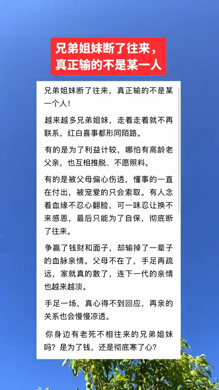 兄弟姐妹断了往来,真正输的不是某一个人。 越来越多兄弟姐妹走着走着就不再联系,红白喜事都形同陌路。有的是为了利益计较,哪怕有高龄老父亲也互相推脱、不愿照料。有的是被父母偏心伤透,懂事的一直在付出,被宠爱的只会索取。有人念着血缘不忍心翻脸,可一味忍让换不来感恩,最后只能为了自保彻底断了往来。 争赢了钱财和面子,却输掉了一辈子的血脉亲情。父母不在了,手足再疏远,家就真的散了,连下一代的亲情也越来越淡。手足一场,真心得不到回应,再亲的关系也会慢慢凉透。 你身边有老死不相往来的兄弟姐妹吗?是为了钱还是彻底寒了心?