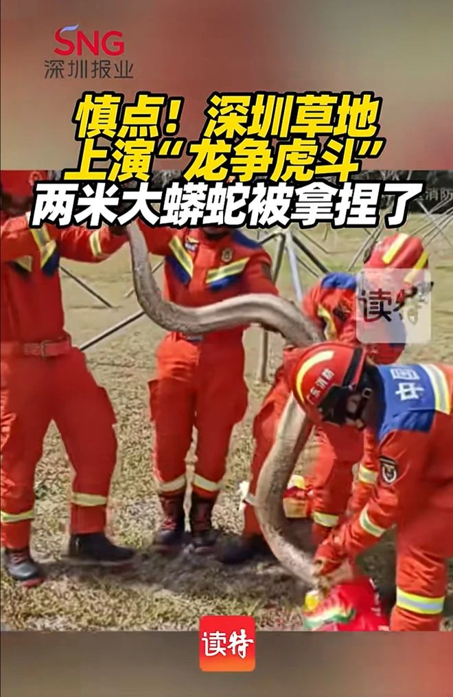 (细节钩子) “你知道吗?这条大蟒蛇被抓住时,肚子里还装着一只刚吞下的成年野兔!” 据野生动物救助中心工作人员介绍,这条蟒蛇属于缅甸蟒,无毒,体重约25公斤,看体型至少有5年以上寿命。从它鼓起的肚子判断,应该是刚在附近捕食了一只野兔,正趴在草地上晒太阳消化食物。 “缅甸蟒是深圳的‘常住居民’,尤其喜欢在有水源、食物充足的地方活动。”救助中心专家解释,近年来随着深圳生态环境越来越好,蟒蛇、野猪等野生动物频频出现在市区。2025年至今,深圳消防已经接到超过300起蛇类出没的报警,其中近10%是体型超过1.5米的大蟒蛇。