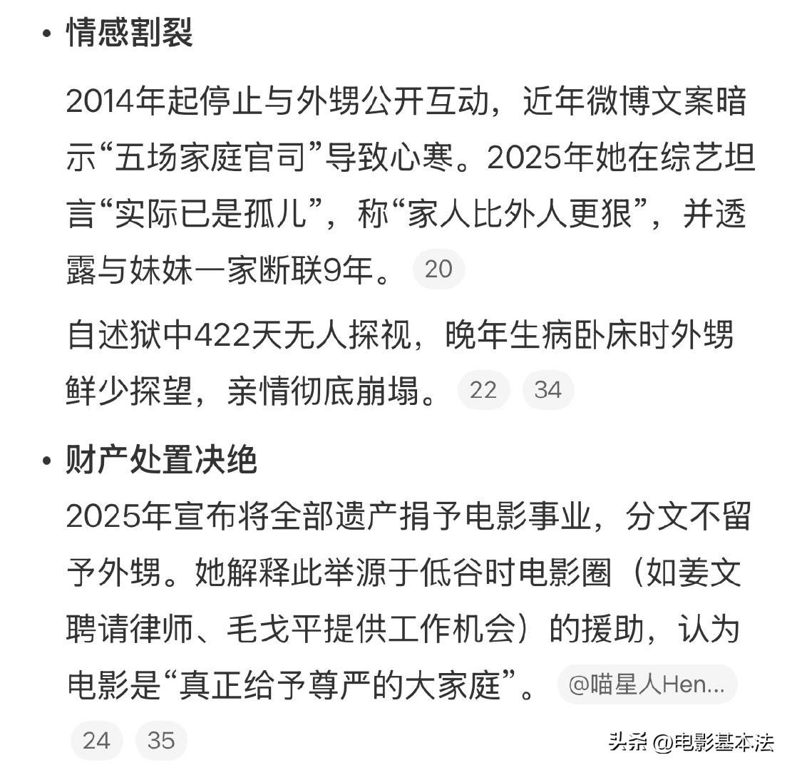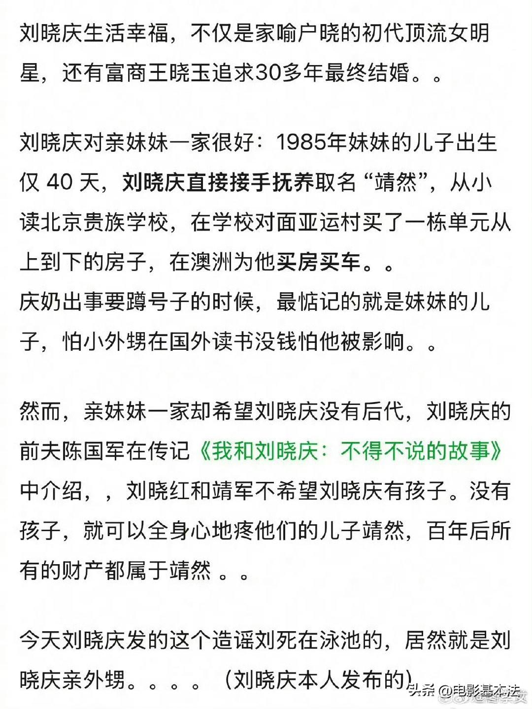 刘晓庆被外甥造谣去世,这就是她没有自己孩子的后果。 刘晓庆一直没有孩子,一开始和妹妹关系非常好,就非常疼爱妹妹的孩子,就是自己的外甥,一度把外甥当自己的孩子养。 刘晓庆很有钱,又没有自己的孩子,又把外甥当自己儿子,久而久之,就让妹妹一家产生一种错觉,就是刘晓庆将来会把所有家产留给外甥继承。 时间再长点,妹妹一家发现刘晓庆根本没有这种意思,然后关系就迅速恶化了。 如果刘晓庆有自己的孩子,妹妹一家是不可能产生这种错觉或幻觉的,这就是没有自己孩子的坏处之一。 不要孩子,固然能让自己的负担更轻,但是如果又很有钱又没有孩子,那么很容易让身边原本亲近的人生出不该有的心思。 现在很多人觉得不生孩子很轻松,但是殊不知,没有孩子到晚年可能面临的问题和出现问题的概率,要比有自己孩子多的多和大的多,没有孩子,到最后你的麻烦和烦恼一样不会少。 所以,大胆追求自己的幸福吧,趁年轻时拥有一个温馨的家,是人类最幸福的事,没有之一。
