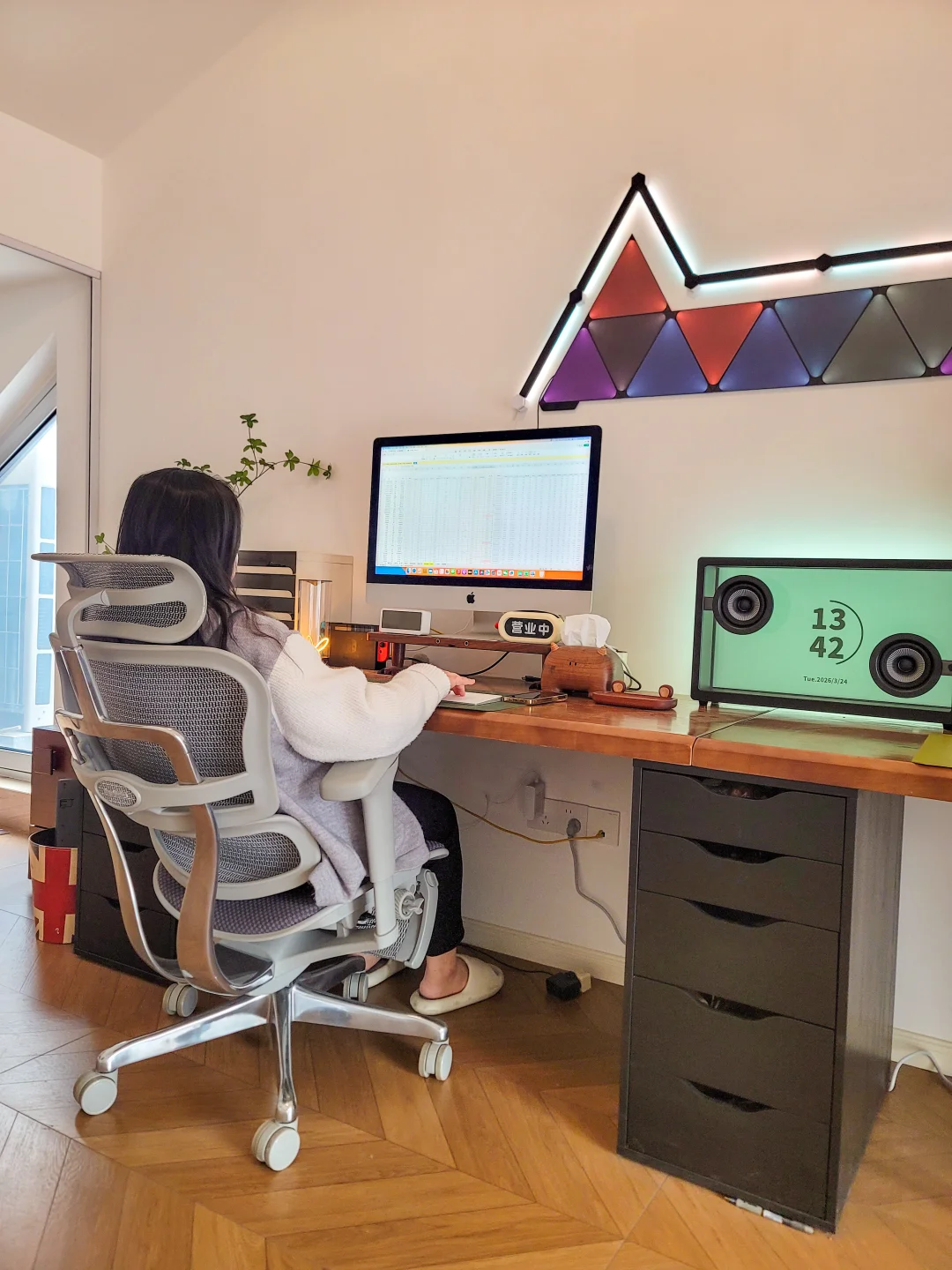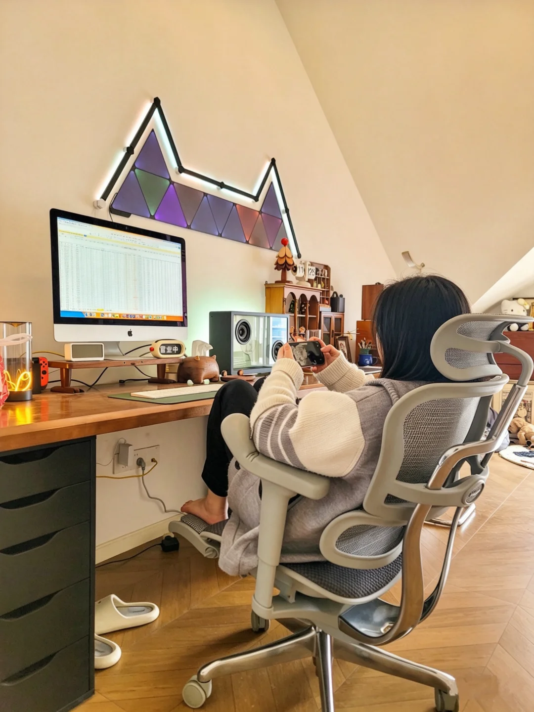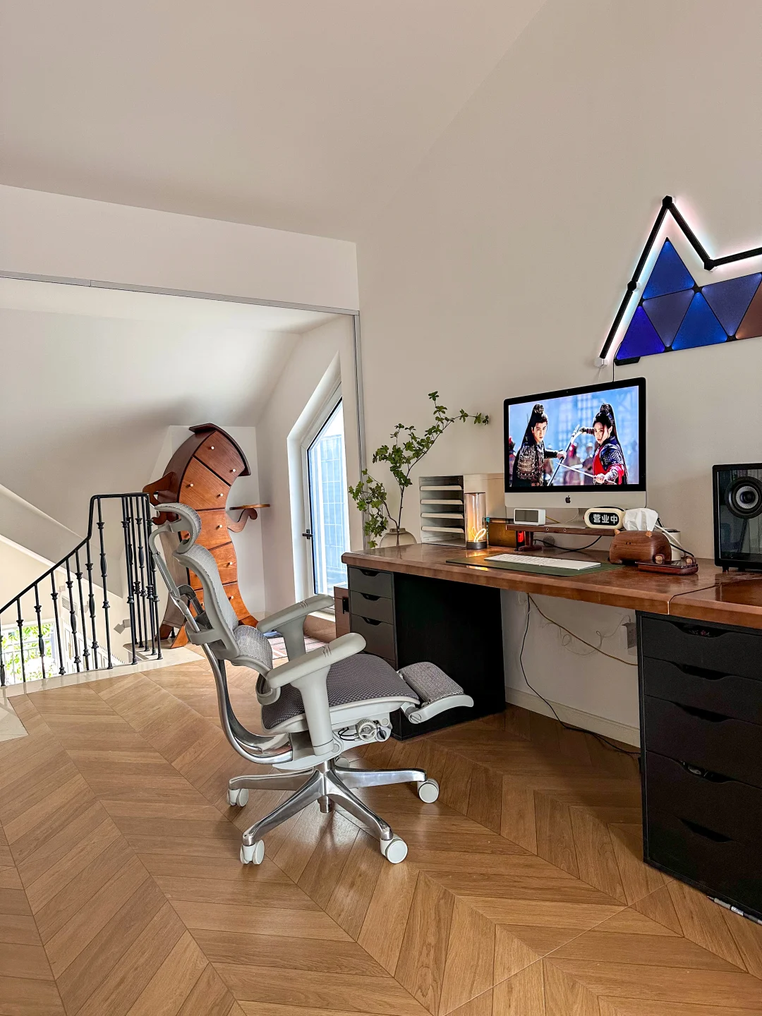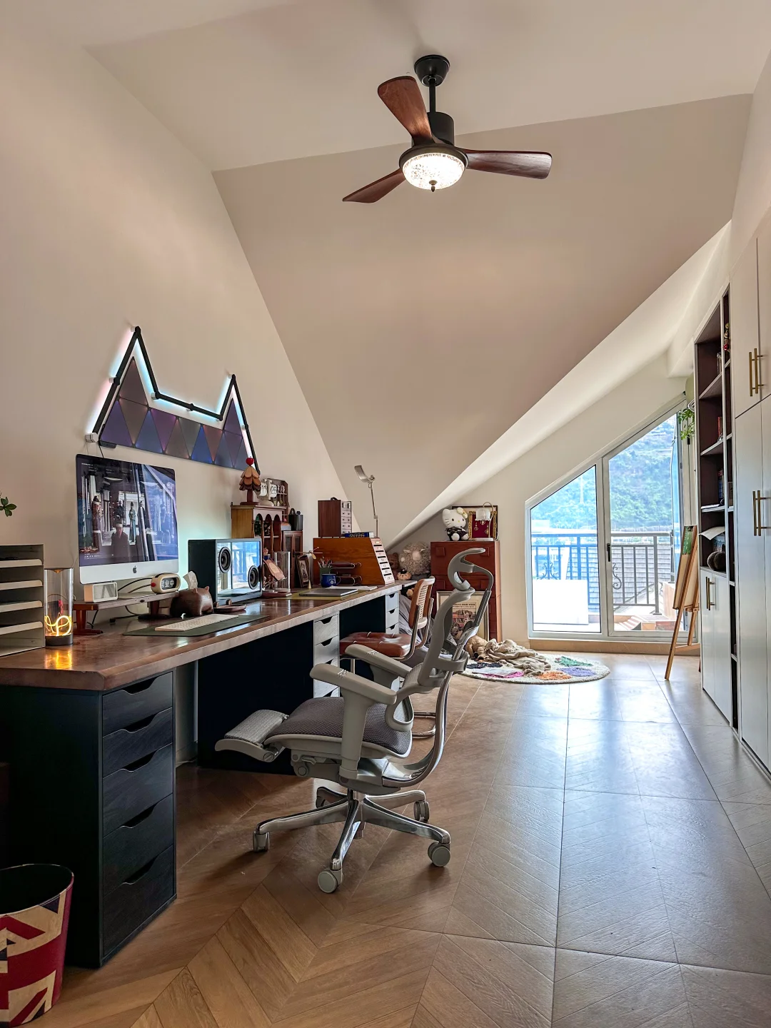把阁楼改造成电竞书房,是我做过最对的决定。 延续复古格调,地板通铺了木纹砖地板,3.6米超长实木书桌,婚后还能和队友做同桌,胡桃木肌理在暖光下泛着温润的光。 外面有10平米的小阳台,落地窗把绿意和山景都框进来,累了就出去看看风景,风里都是自由的味道。 桌面摆满了我的小欢喜:复古音箱、盲盒摆件、没看完的书,还有随时能切换的工作/游戏界面的电竞椅,包裹感能支撑我从清晨敲字到深夜开黑。 这里没有冰冷的办公感,只有温柔的烟火和热爱的温度,是我能待一整天的精神自留地。