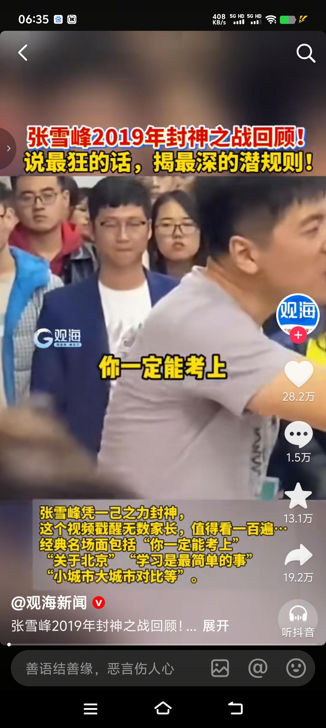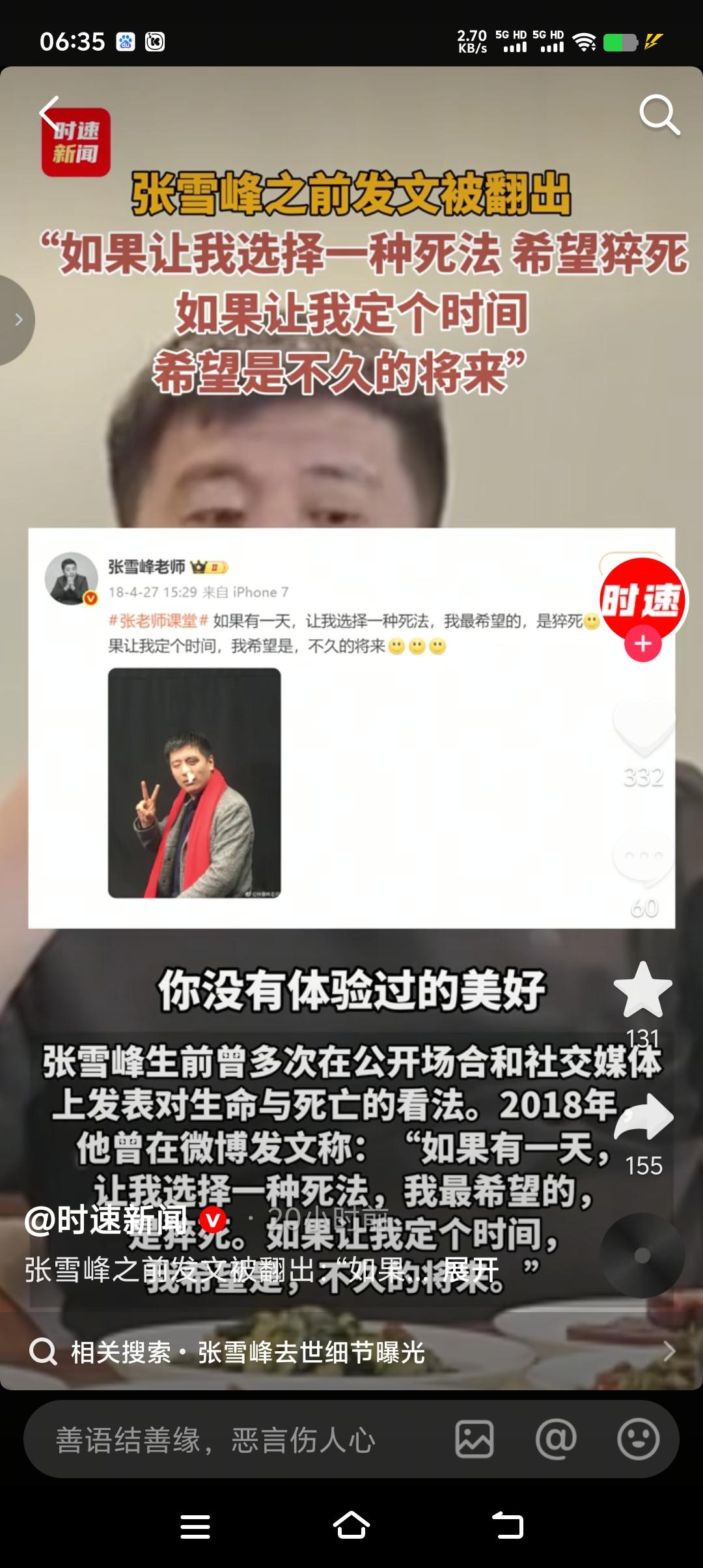 你可以说他狂,说他傲,说他性子急,说他脾气爆,但绝对不能说他不是那块演讲的料,除非你没听过他的演讲。可以这么说,他就是天生为演讲而来到这个世界上的。他的演讲不仅专业知识性强,更主要的是妙语连珠、幽默风趣。听他的演讲就是一种享受,就是一场不是相声胜似相声的大师级别的演讲。 猝死从某种意义上来说也是一种福报,死亡是人生的最后一站,是每个人的必经之路。没有痛苦,没有感觉,没有恐惧便完成了人生最后的使命,所以说张雪峰的死也算是一种福报。只不过是提前完成使命,去了另一个世界了。