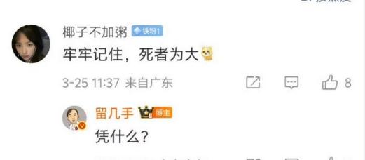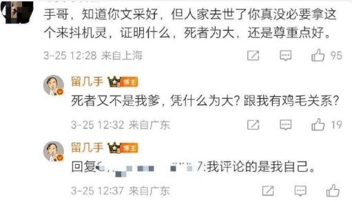 网红留几手太没有口德了,张雪峰不幸去世的事情,留几手竟然用那样贬损的方式去调侃,真的非常不尊重逝者。不论大家对张雪峰这个人是什么看法,特别是留几手还是几百万粉丝的大网红,真不应该在张雪峰去世后这样去说人家。 留几手的粉丝还是很善良的,都在评论区劝留几手尊重一下“死者为大”良善之心,但留几手非但不接受粉丝的劝说,反而再出恶言,这说明留几手的价值观是有点问题的。 从留几手这次的言论,大概也理解了他在芒果tv节目对待自己妻子葛夕的态度,可能网络成名让他过度自信傲慢,没有对其他人尊重的意识,也包括对自己的妻子。还好现实也给了他一闷棍,最终妻子葛夕选择了与他离婚,我觉得葛夕真的算是醒悟了,果断止损还不算晚。