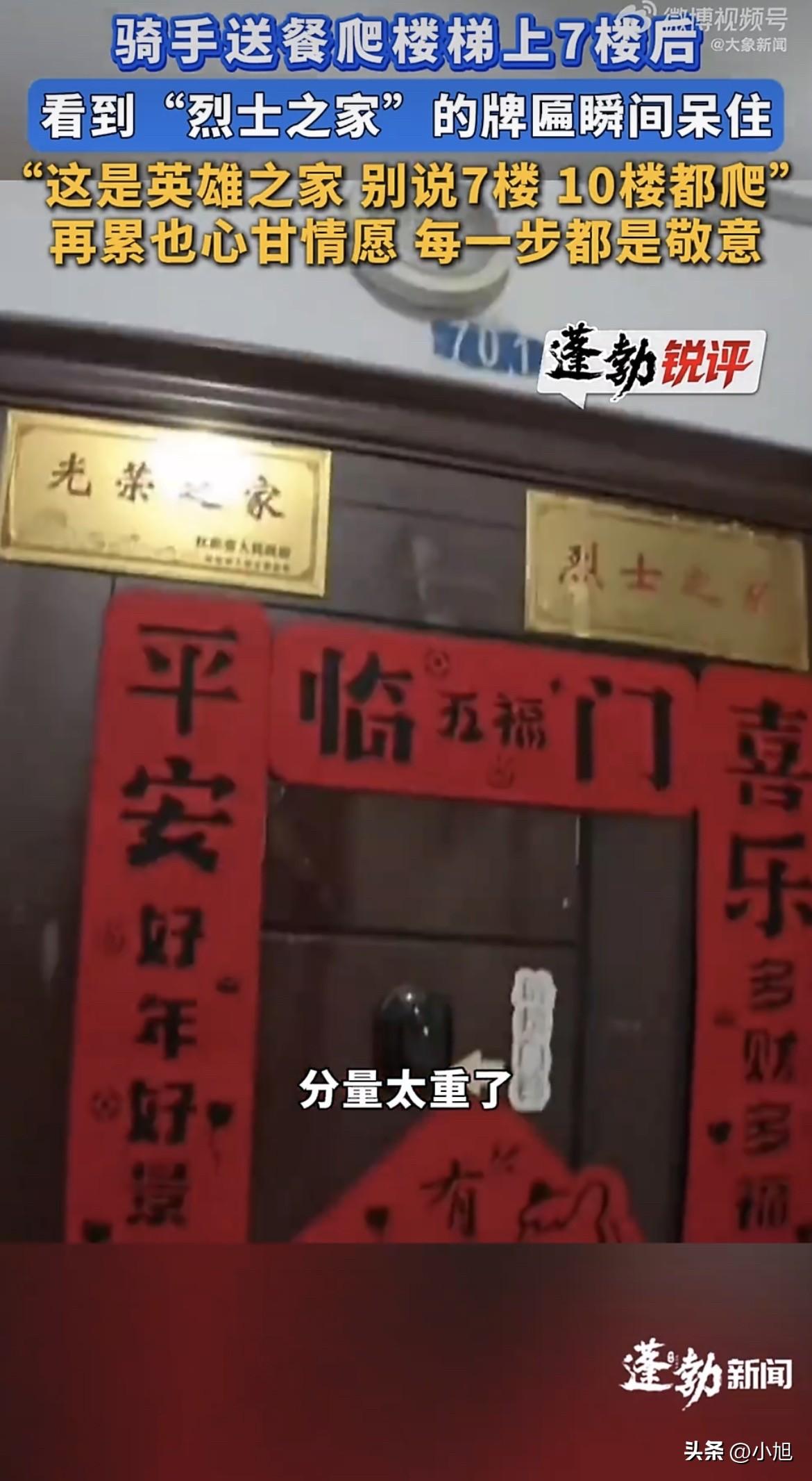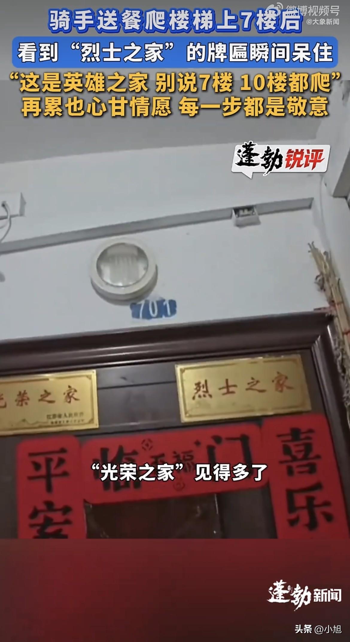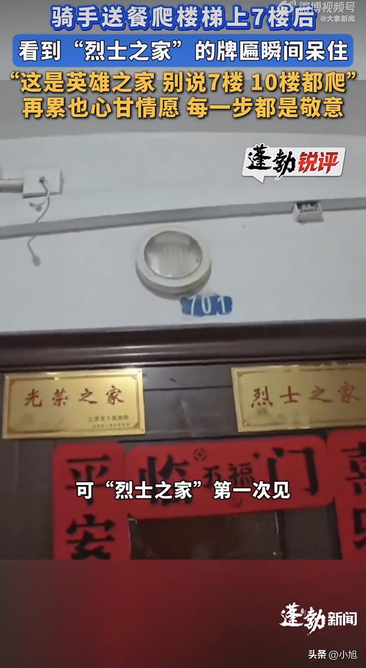 外卖小哥接了个单,7楼,没有电梯。 他爬到第4层的时候腿已经有点酸了,心里多少有点抱怨。送外卖的都这样,步梯房7楼,累不说,耽误时间,下一单搞不好要超时。 备注写得很清楚:“骑手辛苦了,请送上楼,家里父母老人在家。” 他一层一层往上爬,到了门口,抬手准备敲门。 余光扫到门框上方挂着的牌子。左边一块,“光荣之家”。跑了这么多年外卖,这牌子见过不少。他的目光往右边挪了一下。 “烈士之家。” 四个字,红底金字,安安静静挂在那儿。 骑手后来说,那一刻大脑一片空白,像被什么东西狠狠撞了一下。刚才爬楼的累、那点抱怨,一瞬间全没了。他脑子里就一个念头:别说7楼,10楼、20楼,我也得给人好好送到门口。 “光荣之家”常见,“烈士之家”头一回见。 两块牌子挨在一起,左边是这个家曾经的荣光,右边是这个家为这份荣光付出的代价。有网友评论说,一开始以为是双从军家庭,再往右一看,眼睛一下就酸了。 很多人不知道这两块牌子的区别。 “光荣之家”是由省级人民政府统一制作的,落款是省政府的名字,烈士遗属家庭也可以申请悬挂。但“烈士之家”不一样,挂上这块牌子,意味着这个家里有人拿到了《烈士证明书》,家属是持证人家庭。 按照《光荣牌悬挂服务管理工作规定》,光荣牌是褒扬为国家、国防和人民牺牲奉献的荣誉载体和象征,应当得到尊重和爱护。这个规定是退役军人事务部印发的,专门用来规范光荣牌的管理。 骑手送完这单,做了一件事。 他专门给下单的顾客发了条消息,把自己的手机号留了过去。他说自己就在这一片跑单,往后家里老人有什么需要帮忙的,搬东西也好,跑个腿也好,随时打电话。 这话说得实在,没有多余的客套。 下单的人是谁?大概率是老人的子女。子女不在身边,点个外卖都得备注一句“家里父母老人在家”。子女怕老人爬楼累,怕老人做饭不方便,只能在订单里多写几个字。 父母在家,门口挂着烈士的牌子。 这家人经历了什么,外人不知道。但骑手看到了,他记住了,他留了电话。 有网友说,看到“烈士之家”四个字,眼泪一下子就下来了。也有人说,和平年代,哪有什么岁月静好,不过是有人替我们负重前行。 但我觉得,骑手那句话最戳人:“别说7楼了,10楼我都给你爬。” 他说这话的时候,不是喊口号,是真的在爬楼。是真的气喘吁吁爬到7楼,看见那块牌子,瞬间觉得自己那点累不算什么。 按照《光荣牌悬挂服务管理工作规定》,光荣牌发生老化、破损,可以申请更换。但有一条很关键:悬挂光荣牌家庭的“三属”或者退役军人去世后,该家庭可继续悬挂光荣牌,但不再更换。 也就是说,这块牌子,会一直挂在那里。 哪怕有一天,这扇门里不再有人居住,路过的人抬头看见“烈士之家”四个字,心里也会多一份沉甸甸的敬意。 2007年的时候,广东省搞过一次全省统一的光荣门牌悬挂工作。当时的数据显示,全省共需张挂12.5万个光荣门牌,其中“光荣之家”门牌只有2.4万个。18年过去了,这个数字只会更少。 所以外卖小哥说,跑了这么多年外卖,“光荣之家”见过不少,“烈士之家”是头一回见。 这也难怪他愣住。 来源:蓬勃新闻、网易新闻、退役军人事务部《光荣牌悬挂服务管理工作规定》等