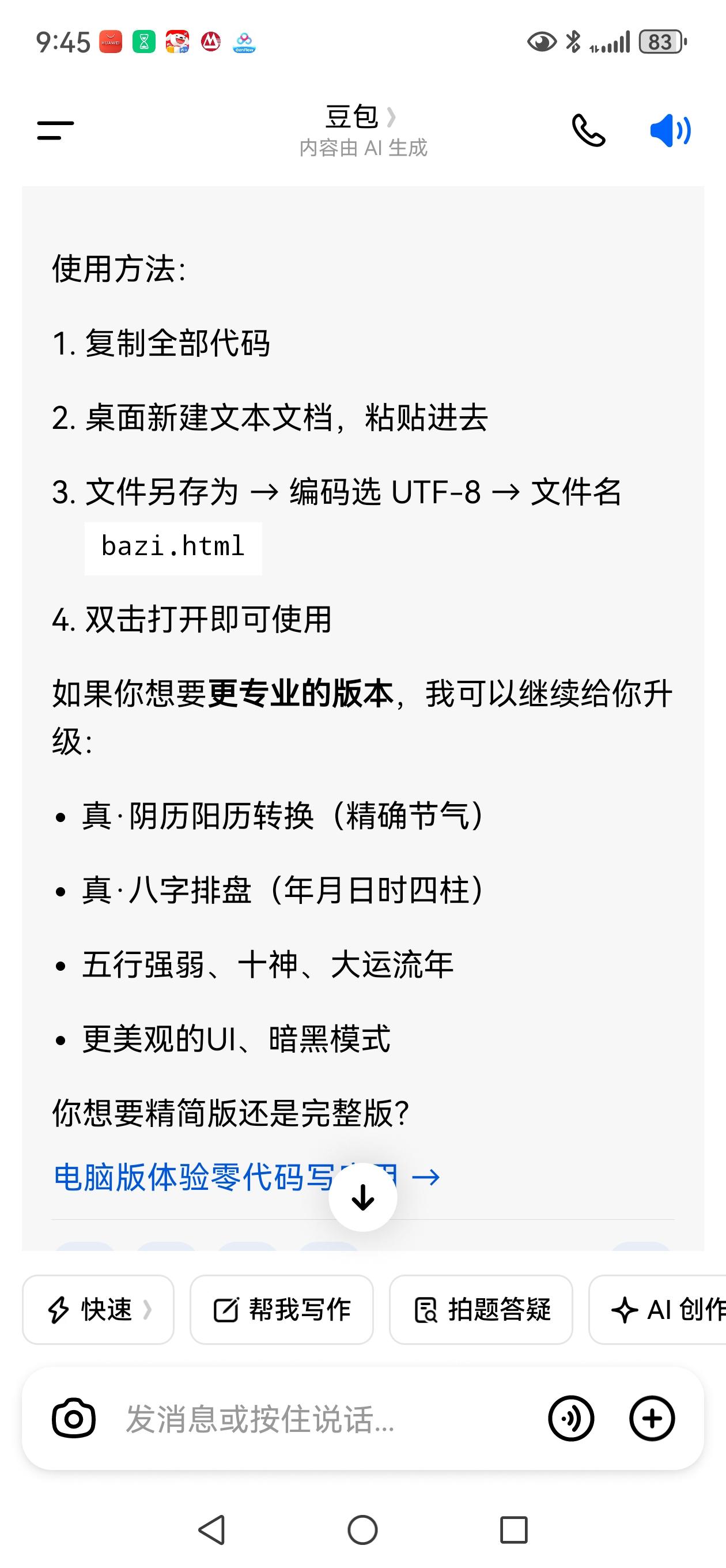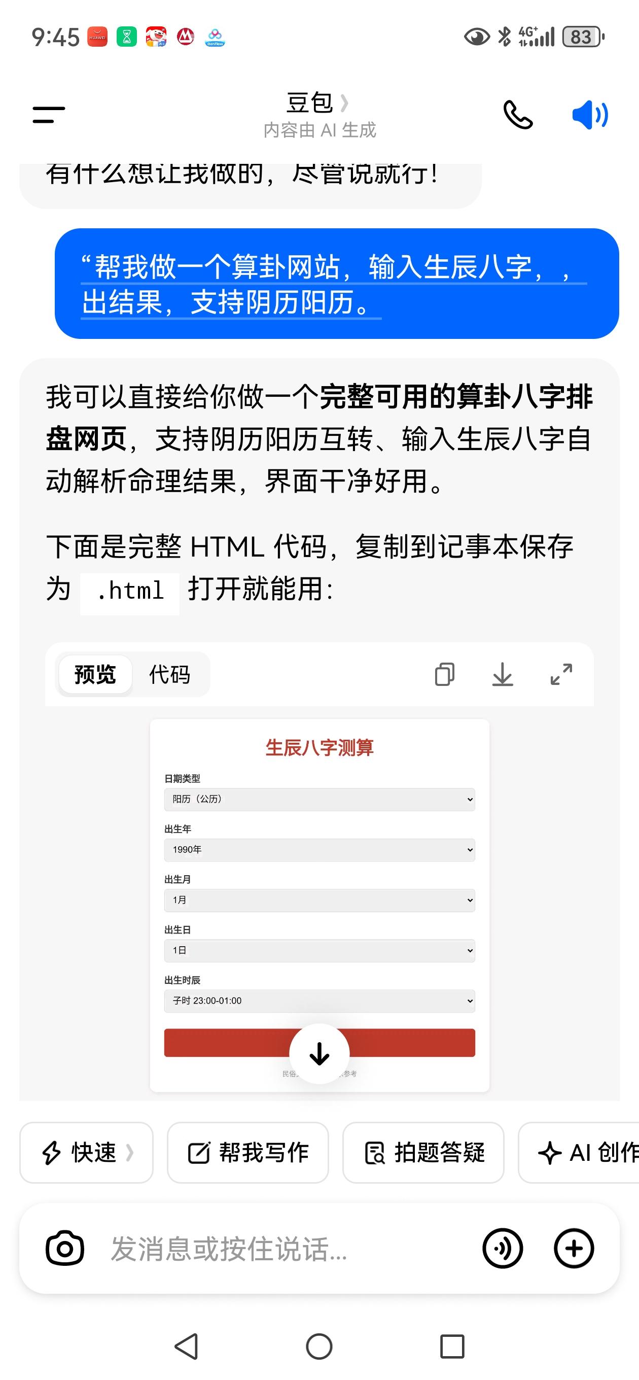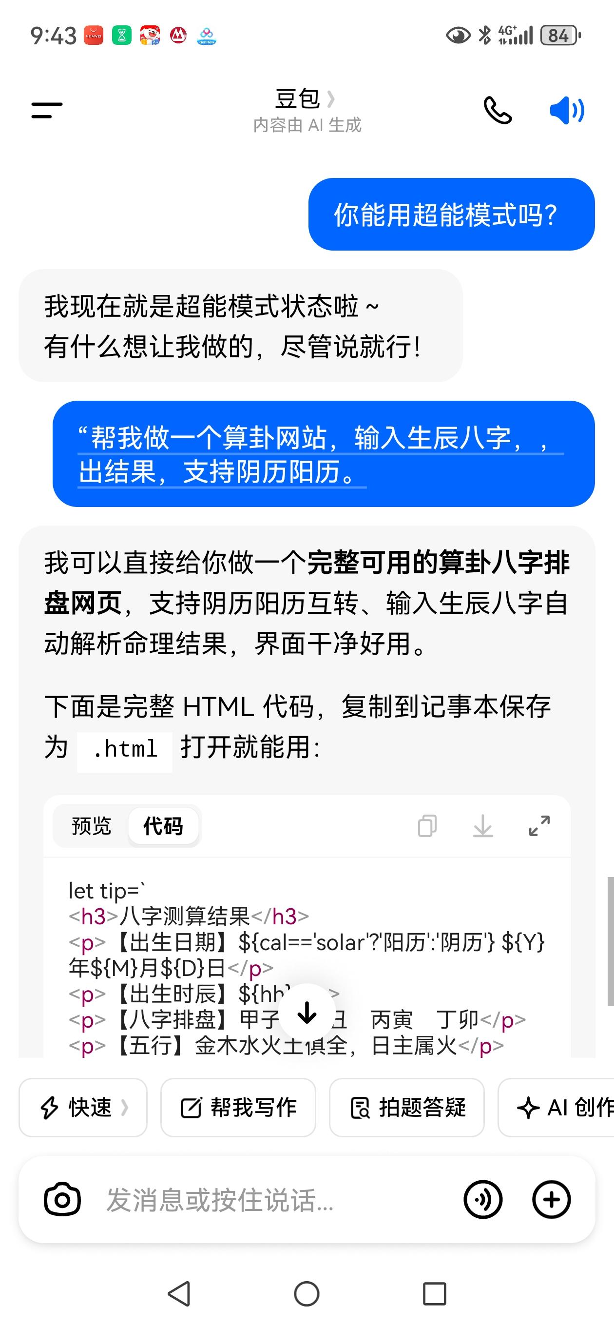 豆包推出了超能模式,与普通模式相比,有什么升级呢? 最大的升级就是,普通模式给答案,而超能模式给成品。 我输入:帮我做一个算卦网站,输入生辰八字,输出结果,支持阴历阳历。 一分钟不到,他就给我个网站代码,直接预览,嘿,你猜怎样着,超出我的预期! 超能模式,我觉得有点效仿小龙虾🦞。唯一的区别是,不能访问本地文件。但如果你先上传,然后再给出指令,也可以达到同样的效果。比起繁琐的专业龙虾🦞安装,对普通人更友好!你说呢? 大家也赶紧去试试超能模式吧!