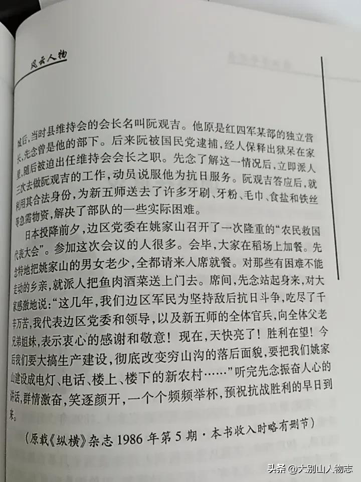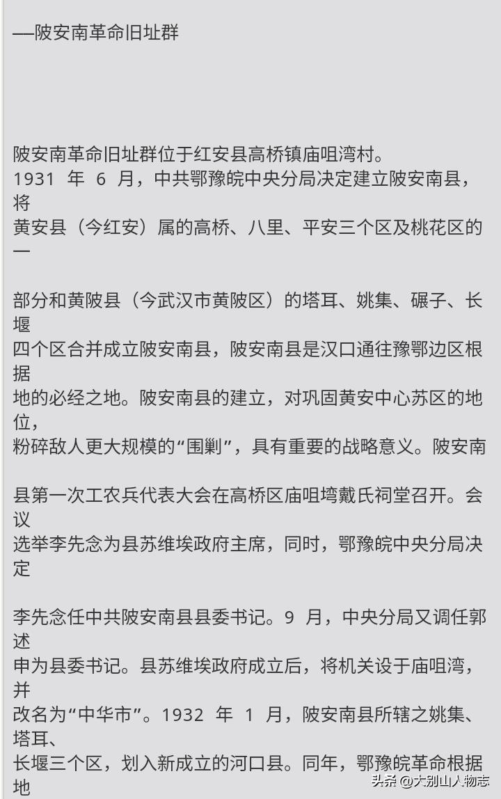 收集和研究大别山的抗战历史,突然发现一件奇怪的事: 1938年日军突破大别山防线,占领湖北的黄陂县城后,其建立的伪维持会,其会长居然曾经是红四方面军的一个营长,而且曾经还是李先念的上级。 红军营长怎么会成为日军的帮凶,到底是卧底还是真正的汉奸?里面一定有玄机。 记载这件奇怪事情的材料,题目是《李先念在黄陂》,最早刊载于1986年的《纵横》杂志上。既然是官办权威杂志,所写“红军营长当日军维持会长”的事,一定是真实的。 这个先是大别山红军营长,后当上黄陂伪维持会长的人,名叫阮观吉。他是黄陂人,黄麻起义后,红军由小变大,很快把黄陂也发展成为红色区域,吃不饱穿不暖的阮观吉也参加了红军,还入了党。因作战勇敢带兵有方,很快成长为骨干。 为了配合主力作战,也为了巩固地方政权,当时的红四军就建立了一个独立营,由阮观吉当营长。 阮观吉带着这个独立营,主要活动在黄陂县东南部和黄安县西南部这一带,也就是现在的木兰湖这一带及周边地区。 用当时红军自己的话说,这里就是己写入红色历史的“陂安南县”。 阮观吉是如何是李先念发生关系的呢? 李先念虽是黄安人,但他家就在黄安与黄陂的交界处,在参加革命前李先念就在黄陂境内的袁师傅家学的本匠。 红军创建“陂安南苏维埃政府”后,李先念先是在乡里当苏维埃政府的主席(类似乡长),后提拔到县里当苏维埃政府主席(类似县长)。 就是在这个时候,李先念开始与阮观吉认识。此时的阮观吉是红军独立营的营长,李先念是乡政府的主席。从职位上看,阮观吉应该还是李先念的上级。 让人奇怪的是,阮观吉既然曾经是红军营长,日本人打来时,怎么会当了汉奸? 事情的真相是这样的:在一次作战中,阮观吉带的队伍遭到国民党军队的伏击,部队损失很大,他本人也被国军俘获。被打入监牢后,经人出面保释,阮观吉后来被放了出来。 由于各种原因,也许也有意志动摇的原因,阮观吉选择待在家里,再也不愿出来活动。 日本人打进大别山后,到处搜罗“地富反坏”份子建立伪政权,就连阮观吉也成了他们拉陇的对象。 阮观吉人生中的又一个污点,就是在这个时候出现的。他居然答应日本人,开始走出家门,当上了由日本人掌控的县维持会的会长。这不就是汉奸吗? 1939年初,从河西走廊死里逃生的李先念,带着一支队伍打着新四军的旗帜,从延安经河南竹沟南下,回到湖北境内开始抗日,不断做大做强,最后发展成为新四军第五师。 李先念回到大别山后,听说自己曾经的老上级阮观吉不仅当了汉奸,还是黄陂县的伪维持会长,立即派人去找他做工作,前前后后派了三拨人,终于成功说服了他,要他利用特殊身份,暗中为抗日尽自己的义务。 受李先念大义感召,阮观吉明确表态:身在曹营心在汉,绝不做伤天害理的事。 据《李先念在黄陂》一文介绍,为了支援抗战,阮观吉“利用合法身份,为新四军五师送去了许多牙刷、牙粉、毛巾、食盐和铁丝等急需物质,解决了部队中的一些实际困难”。 遗憾的是,由于资料极其有限,记载也很不全,我们对于阮观吉的背景资料和以后的结局如何,仍然不得而知。不知道有没有知情者可以提供?