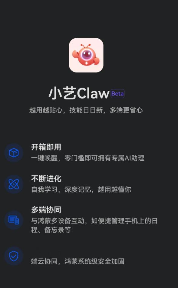 用户可在小艺App内输入“小艺Claw预约”进行预约。据介绍,小艺Claw支持开箱即用,可一键唤醒;支持自我学习、深度记忆,可不断进化;支持多端协同,可与鸿蒙多设备互动,如便捷管理手机的日程、备忘录等;支持端云协同,拥有鸿蒙系统级安全加固。