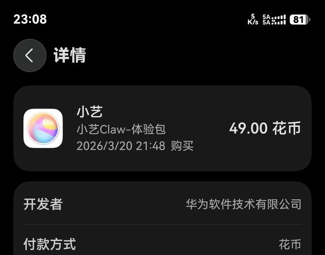 小艺Claw服务需付费开通。而据博主@Adak封狼居胥透露,小艺Claw的服务价格为199元6000点数、49元1000点数,支持使用花币付款。