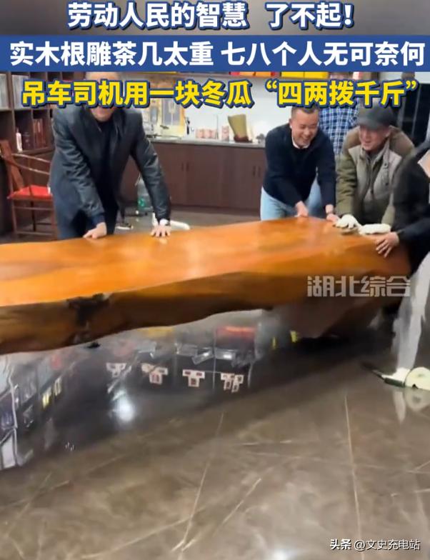 人怎么能这么聪明!3月25日报道,上海一公司搬家,但大厅里的一张重达千斤的实木根雕茶桌却让人犯了难,一堆人上前都抬不动,不料,这时吊车司机上前,仅仅用一个冬瓜,就把问题给解决了。网友:劳动人民的智慧![太阳] 前阵子上海有家公司搬办公室,大厅里一张实木根雕茶桌难住了所有人,工人估算这桌子有近千斤重,之前搬别的家具的法子在这上面根本不管用。 一开始找了七八个搬家师傅一起搭手抬,结果桌脚就像钉死在地上似的,纹丝不动。 本来都已经联系了吊车,打算用吊具把这大家伙吊出去,这也是当时能想到的唯一办法。 吊车司机到了现场,看了半天情况,没急着去拆吊具准备干活,他反而回到自己的车上翻了翻,没多久就拎着个新鲜冬瓜走了过来。 旁边几个忙活了半天的师傅都看愣了,没人能想明白,这冬瓜能帮上挪桌子的忙,毕竟这时候大家满脑子都是怎么把这重桌子吊出去,没人把冬瓜和这事联系起来。 没管大家的疑惑,司机找了把刀,把冬瓜连皮切成了厚片,带皮是怕切太薄的瓜片一压就碎。 他让师傅们把桌角挨个抬起来半寸,把切好的冬瓜片,挨个塞到了四个桌脚底下,等四个角都塞好,有人试着伸手推了推茶桌,没想到接下来的一幕让所有人都吃了一惊。 刚才还稳得挪不动的大家伙,居然顺着光滑的瓷砖地面滑了起来,推起来的力道比推个普通的衣柜还要轻,就像桌脚底下装了隐形的滑轮。 后来有人琢磨明白,这其实就是利用了冬瓜瓤的润滑作用,湿软细腻的瓜瓤把桌脚和地面之间的摩擦力降了大半,带皮的瓜片还能撑住重量不会碎。 用完的冬瓜片直接收走扔掉,瓷砖地面一点划痕都没留,茶桌的脚也没磕着碰着。 本来要花大几百的吊装费,最后几块钱的冬瓜就搞定了,这事说出去谁听了都觉得新鲜。 这事后来被现场的师傅拍了视频发到网上,不少人看完都感叹,这才是劳动人民的真智慧。 很多人提到解决难题,第一反应就是找专业工具,或者花大价钱请人,总觉得越贵的办法越靠谱。 但其实不少棘手的问题,解法往往就藏在身边的寻常物件里。 那个吊车司机干了多年的吊装搬家,没学过什么复杂的物理公式,就是见得多了,摸透了这些日常东西的特性。 现在不少人都在说降本增效,其实很多时候,真正的效能提升根本不是买多贵的新设备,也不是改多复杂的工作流程,而是把手里的资源用透,把干活攒下的经验用活。 几块钱的冬瓜,就能解决大几百吊装都差点搞不定的事,这才是最实在的降本。