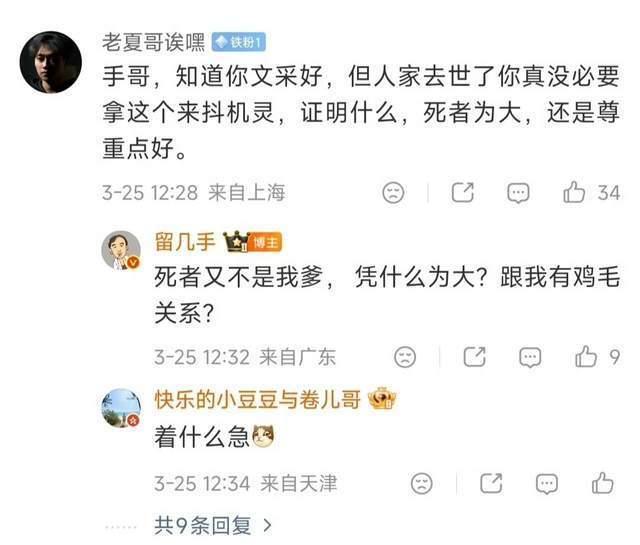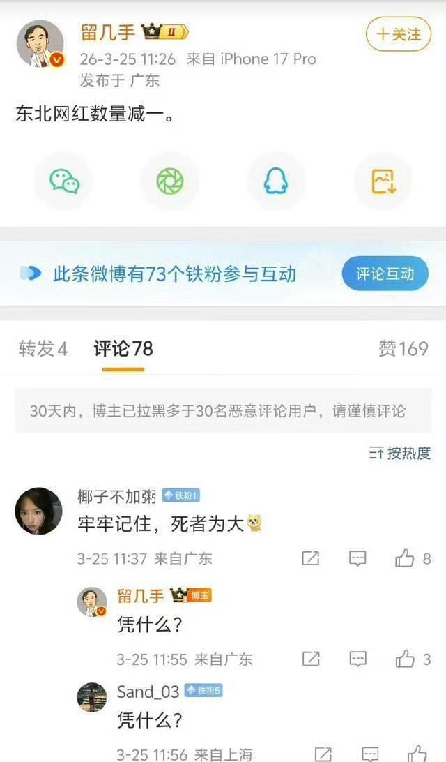 最新消息,千万网红留几手的账号已被禁止关注,最大的原因或许是他昨日对张雪峰去世一事的调侃,引发了大众的强烈反感。 当粉丝提醒他“死者为大”时,他还强硬回应:“死者又不是我爹,凭什么为大?跟我有什么关系?” 对于这种蹭热度的方式,引起了大家强烈的情绪。过后不久留几手删除了此帖子,但依然难逃被封禁的处罚。