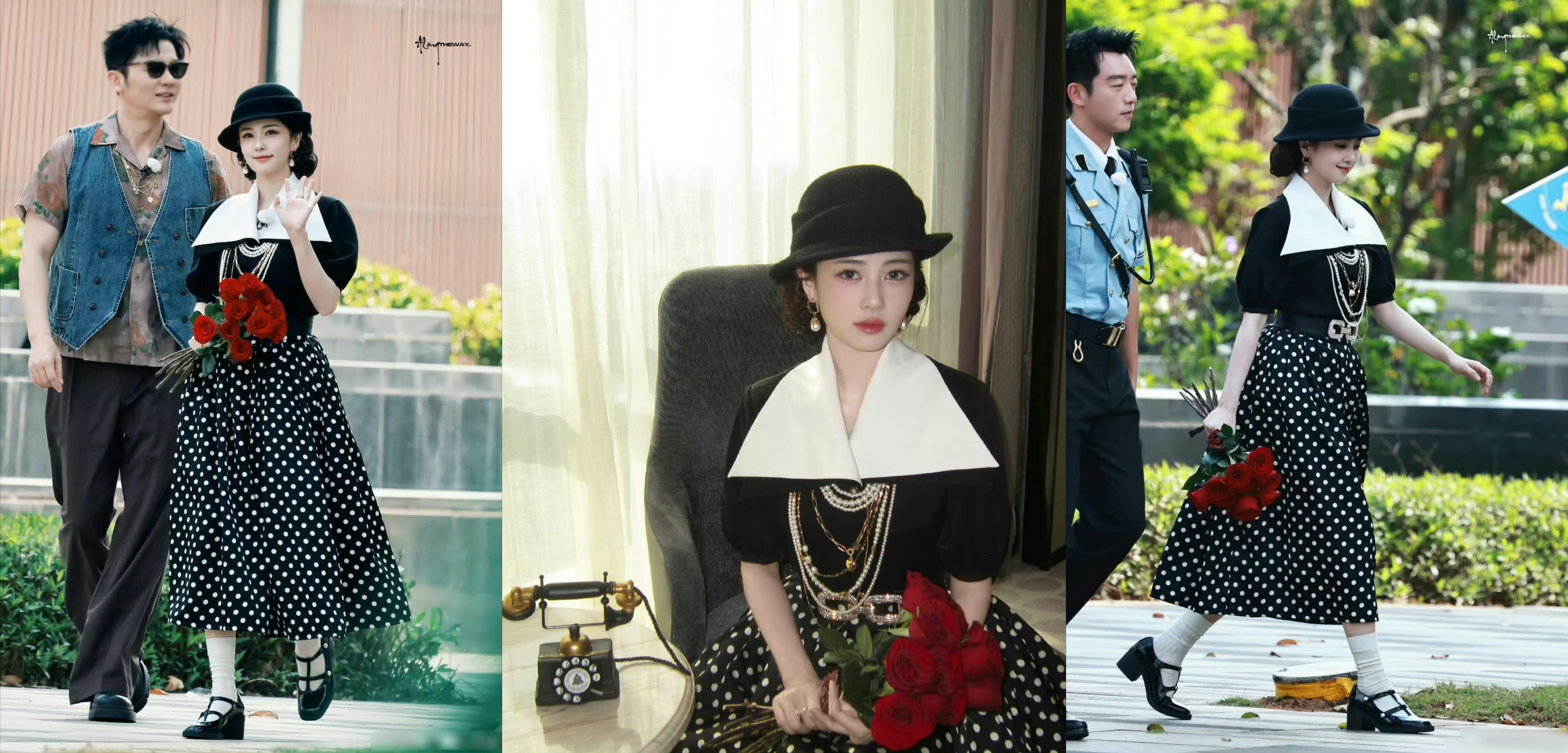黑底波点长裙衬着利落的大翻领白衬,复古礼帽轻压着微卷的发丝,层叠珍珠项链缀出贵气,手里的红玫瑰又添了几分娇俏灵动,活脱脱是从旧画报里走出来的留洋小姐,优雅里藏着少女的鲜活。造型出圈,白鹿如呼吸般自然!这波在复古造型里一秒切换气质,难怪观众高呼“递本子”,谁不想看这位既能hold住民国大小姐,又能演好百态人生的演员,在更多故事里绽放万般多彩的光芒呢,希望白鹿在奔跑吧,玩开心,开心就好!白鹿留洋大小姐造型