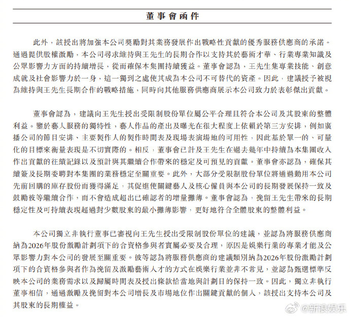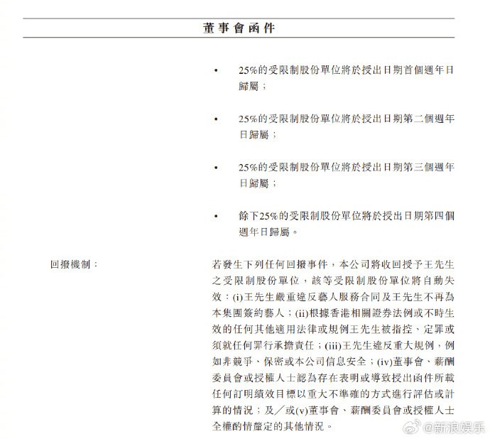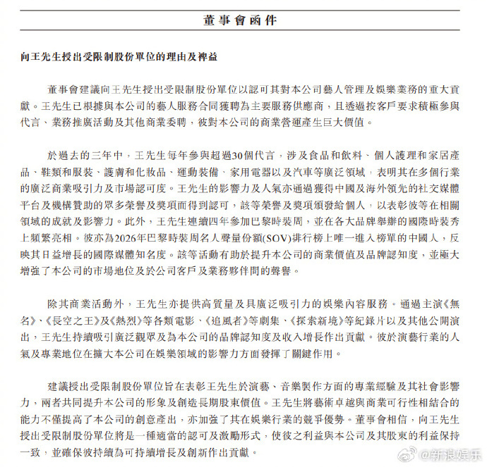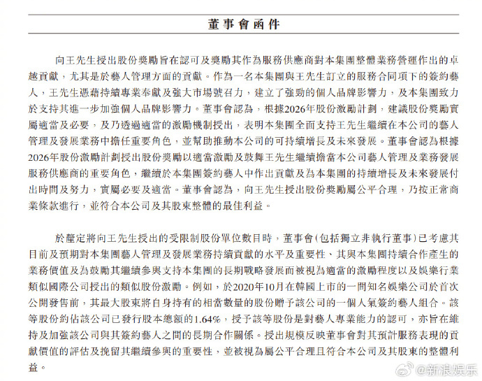 董事会认为,挽留王一博带来的长期稳定性及可持续表现超过对少数股东的最小摊薄影响,更好符合全体股东的整体利益 乐华建议向王一博授出股份奖励