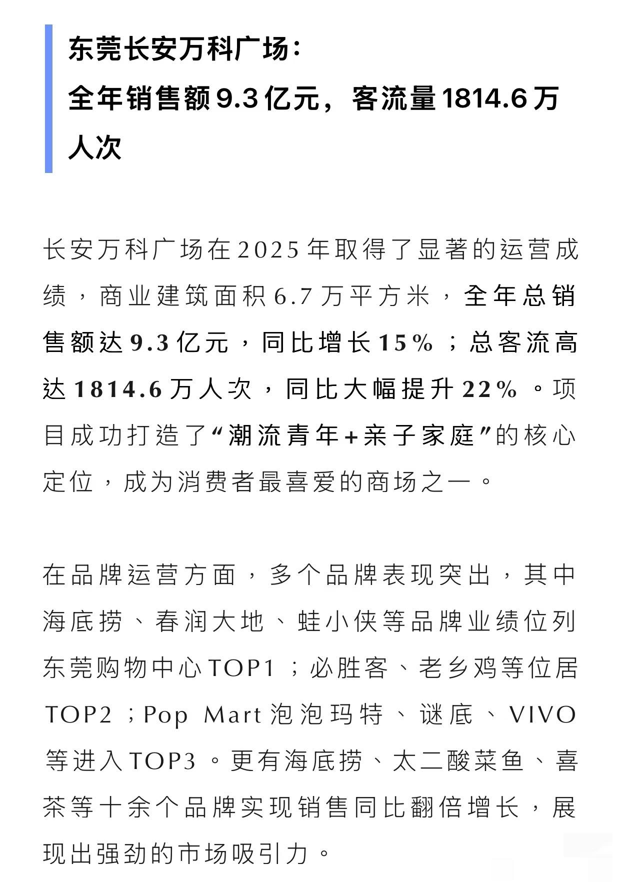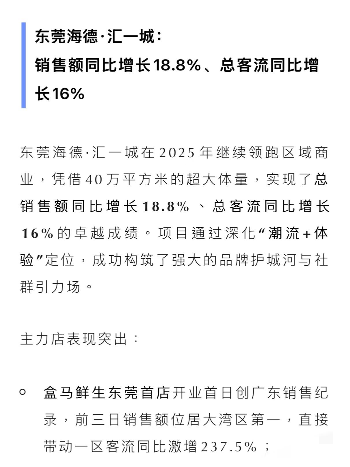 东莞商场头把交椅有悬念了!民盈国贸城2025年卖了36.5亿,暂居第一。海德·汇一城没公开业绩,但按增长算离得很近。两家都猛招首店,民盈有60+,海德也有50+,就看谁能稳到东莞万象城开业了。