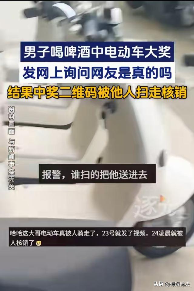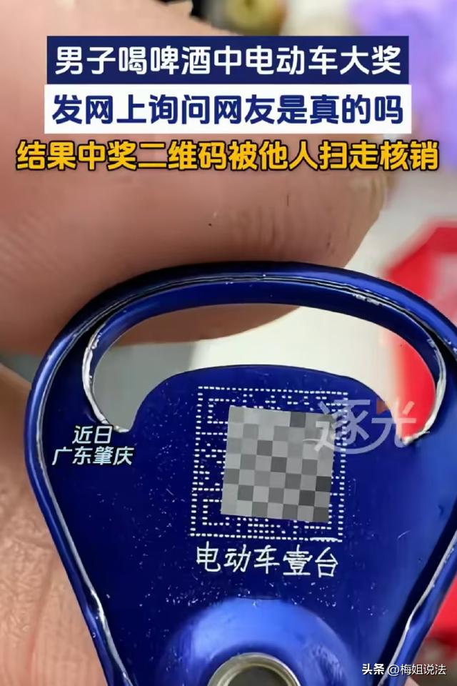 乐极生悲!广东肇庆,男子喝啤酒中了一台电瓶车,拍下二维码炫耀,故意问网友是不是真的,结果几个小时后,码被别人扫走核销了! 3月23日晚上,男子买了几瓶啤酒,拉开拉环后一看,拉环上面有一个码。 男子仔细一看瓶身,原来这个啤酒在搞活动,每罐啤酒拉环上都有一个码,可以参加扫码抽奖,普通小奖是几块到几十块钱的红包,最大奖是一台电瓶车。 男子闲着没事,就扫了扫码,前面两次都没有中奖,但是当他再次打开一瓶啤酒时,发现拉环上多了几个字:电瓶车壹台。 男子以为自己喝多眼花了,使劲揉了揉眼睛,才确认自己真的中奖了。 男子高兴到起飞,从来没有想到这么好的事竟然会落到自己头上。 高兴之余,男子决定装一下炫耀炫耀,于是他将中奖拉环整个拍了下来,发在自己的账号上,还故意得瑟问大家:这是真的吗? 不出所料,发出去之后大家都羡慕坏了,男子的虚荣心得到了极大的满足,可让他没想到的是,很快兴奋被气愤代替了。 男子原本想的是,当时时间太晚了,第2天就去兑奖,可第2天他再扫码的时候,发现那个码竟然已经被核销了! 男子稍一思索,就明白了怎么回事,问题就出在昨天他发的那条动态上。 肯定是有人看到后,扫了那个核销码,把他的电瓶车领走了。 男子觉得拉环在自己手里,对方凭什么领走电瓶车?于是他打电话询问了活动举办方,对方表示,他们之前核销的时候凭码就可以,并不是凭拉环核销,这才导致这种事情的发生。 举办方也没有想到,普通人都是闷声发大财,这个男子中了大奖,竟然还发出去炫耀,结果闹出了这么个乌龙。 事发后有人调侃男子,这下不得瑟了吧?做人做事要低调! 也有人提出建议,这种扫码核销的都可以查到源头,到底是谁领走的电瓶车,一查就知。 那么问题来了,男子中的电瓶车到底属于谁,那个偷偷扫了他的码,领走电瓶车的人的行为,应该怎么认定? 首先,可以明确的人,男子买啤酒后参与活动,最终扫码中奖,男子与活动举办方形成了合法有效的合同关系。 男子拉开拉环显示他中了电瓶车时,合同生效,男子拥有了获得电瓶车的合法权利。 那个偷偷扫走核销码领走电瓶车的人,构成不当得利。 根据《民法典》第九百八十五条规定,得利人没有法律根据取得不当利益的,受损失的人可以请求得利人返还取得的利益。 本次事件中,扫码人没有合法依据,扫走男子的中奖码领走电瓶车,使得男子遭受了财产损失,扫码人获得的电瓶车属于不当利益,男子有权要求其返还。 不过,活动举办方以码核销而非凭拉环核销的方式存在一定漏洞。 虽然举办方制定了核销规则,但该规则没有充分保障中奖者的权益,导致他人有机可乘。 不过,核销规则存在漏洞,也并不影响男子中奖的事实,以及他对电瓶车的合法权益。 虽然电瓶车已经被人扫走了,但是男子作为权利人,完全可以通过报警的方式,要求民警查出扫走电瓶车的人,追回自己的合法财产。