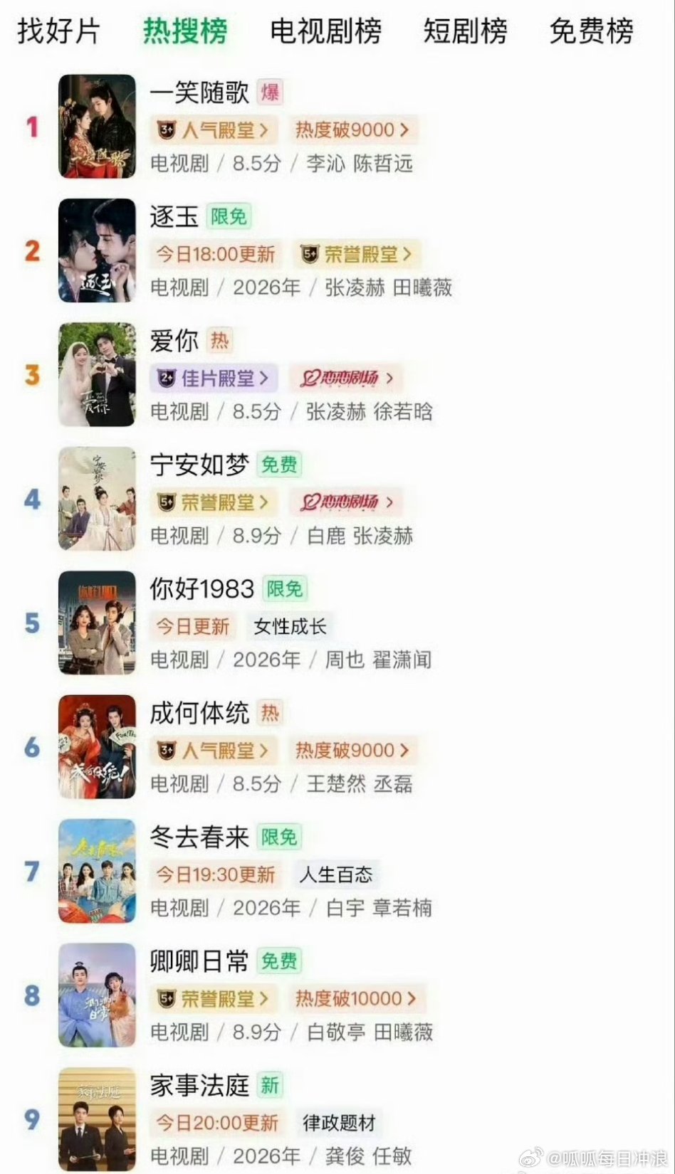🥝双榜:陈哲远《一笑随歌》第一,张凌赫《逐玉》《爱你》第二和第三,前三两部。