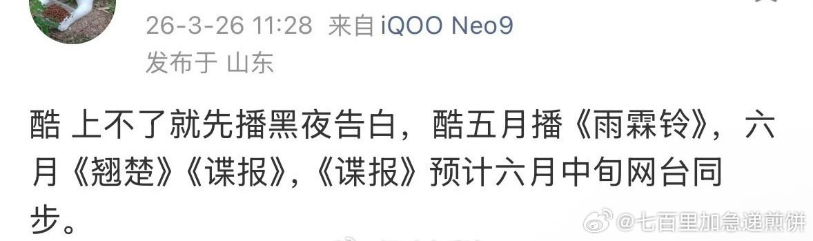 🍉 酷的排播,如果月鳞绮纪暂时不上就先播黑夜告白,五月播《雨霖铃》,六月播《翘楚》《谍报》,《谍报》预计六月中旬网台同步。