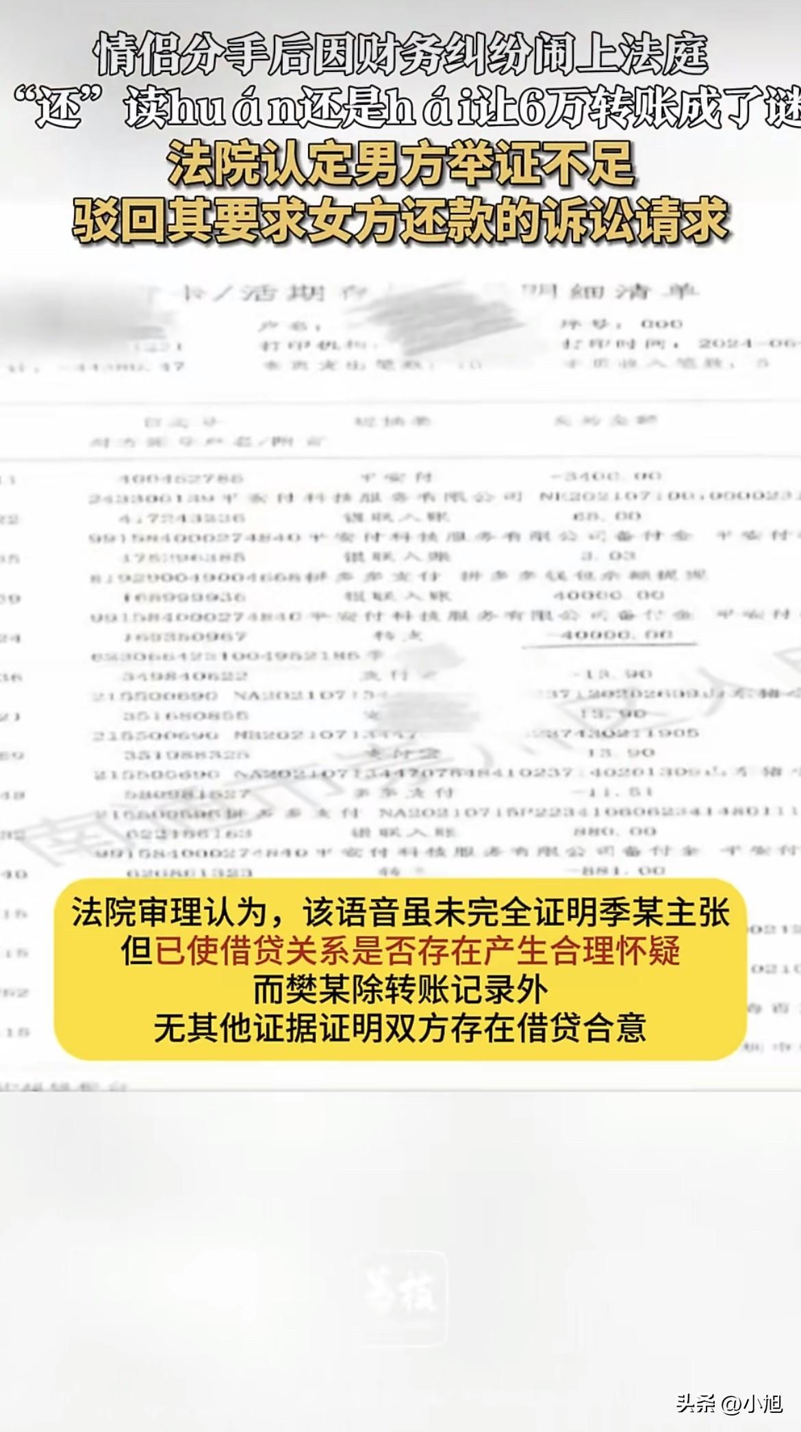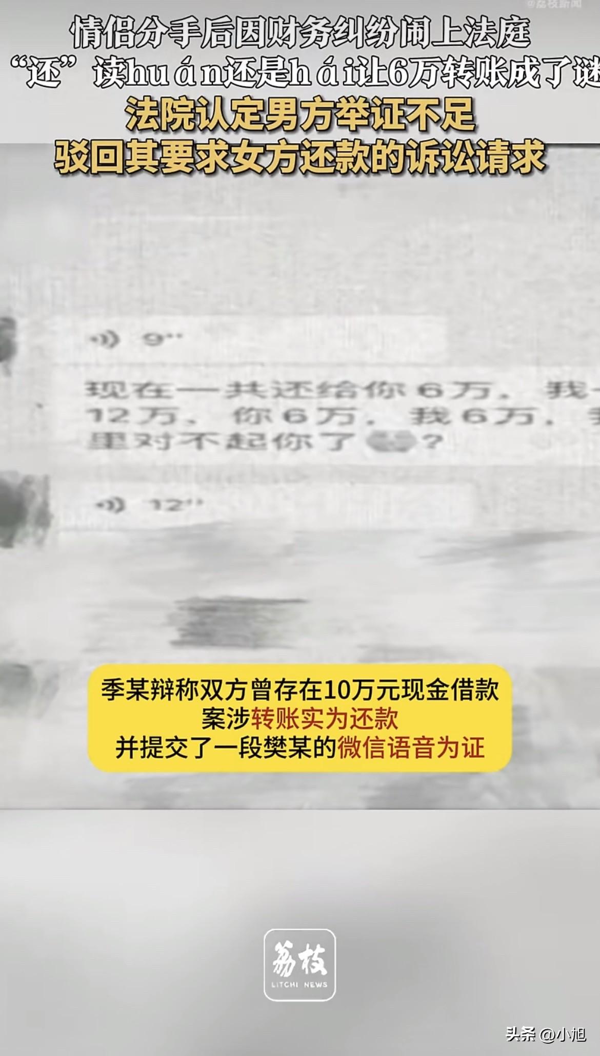 江苏这对情侣因为6万块钱闹上法庭,最后输赢定在一个字怎么读上。这事听起来荒唐,但仔细想想,其实一点都不荒唐。 先还原一下事情经过。 男的叫樊某,女的叫季某。俩人谈恋爱期间,樊某给季某转账69000元,季某给樊某转账8000元。分手以后,樊某把季某告了,要求她归还61000元本金加利息。 季某不认这笔账。她说之前樊某从她这借过10万块现金,是现金借款,不是转账。樊某转给她的这些钱,根本不是借款,而是在还钱。 季某拿出一段微信语音。语音里樊某用方言说了一句话:“我还给了你60000元。” 问题就出在这个“还”字上。这个字两个读音两个意思。读“huán”是归还,读“hái”是仍旧。樊某说他的意思是“我还(hái)给了你6万”,就是说除此之外又给了你6万。季某说他的意思是“我还(huán)给了你6万”,就是说归还了你6万。 两个人说的方言里这两个音几乎一样,根本听不出来。一段6秒的语音,成了6万块钱归属的唯一突破口。 法院最后判樊某败诉。理由是那段语音虽然不能完全证明季某说的是对的,但已经足以让法官产生合理怀疑——这笔钱到底是不是借款,不确定了。而樊某除了转账记录,拿不出任何证明双方有借贷合意的证据。没有借条,没有聊天记录,没有任何能说明“这是在借钱”的东西。 按谁主张谁举证的原则,樊某举证不足,诉讼请求被驳回。 很多人看到这觉得憋屈:明明是对方欠钱,就因为一个字没录清楚就输了? 但仔细琢磨一下这个判决,其实能品出点东西来。 法院的逻辑很清楚:转账记录只能证明钱从A账户到了B账户,不能证明这笔钱的性质是借款。借钱得有两个东西同时存在,一个是钱给了,另一个是两个人都认可这是在借。只有转账记录没有借条,在法律上构不成完整的借款证据链。 这个案子里,季某拿出的那段语音,本质上是在做一件事——制造合理怀疑。她不需要证明“这6万块钱确实是还钱”,她只需要让法官觉得“这6万块钱不一定是借款”,就够了。一旦合理怀疑成立,举证责任就回到了樊某身上。樊某拿不出更多证据,就只能输。 很多人谈恋爱的时候不会想这些。你转我我转你,几千几万块,谁也不好意思让对方写借条。分手了翻脸了,才发现这些钱在法律上全是死账。转账记录只能证明你给过钱,证明不了你是借出去的还是花出去的还是送出去的。 这个案子里还有一个细节值得琢磨。 季某说之前借给樊某10万现金。这个事本身也没证据。但在法庭上,被告不需要证明自己说的是真的,只需要让法官觉得原告说的不一定是真的。这就是为什么一段语音能把整个案子翻过来。 樊某输就输在,他以为有转账记录就够了。他没想到对方手里有一段语音,更没想到这段语音里一个字怎么读能决定6万块钱的归属。 这个案子暴露了一个很现实的问题:很多人在亲密关系里的金钱往来,都是在没有法律意识的情况下完成的。转账的时候谁也不多想,分手了才发现当初的每一笔钱都处于灰色地带。你说这是借的,她说这是你花的,谁也没有过硬证据,最后只能看谁的证据更能让法官相信。 那个“还”字,到底读huán还是hái,也许只有樊某自己知道。但在法庭上,知道没用,得能证明。 这事你怎么看? 来源:南京零距离、荔枝新闻
