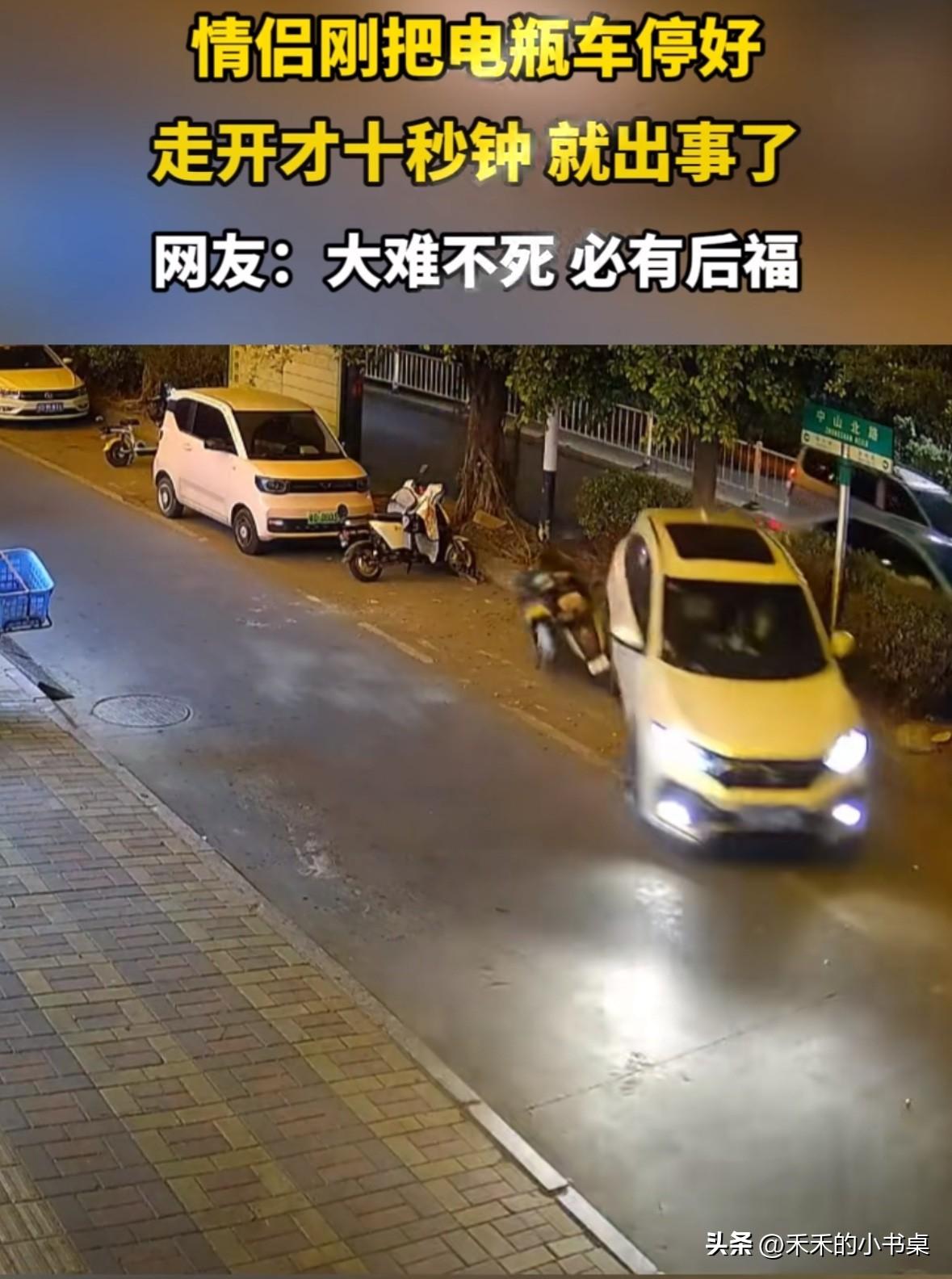 一对情侣上街买东西,刚停好电瓶车离开,前面的白车因为挂错档,直接撞了上去! 试想