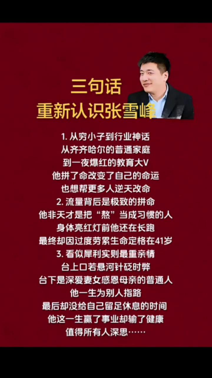 三句话重新认识张雪峰。 ·1.他拼了命改变了自己的命运,也想帮更多人逆天改命。 ·2.流量背后是极致的拼命,他非天才是把"熬"当成习惯的人,身体亮红灯前他还在长跑,最终却因过度劳累生命定格在41岁。 ·3.看似犀利实则最重亲情,台上口若悬河针砭时弊,台下是深爱妻女感恩母亲的普通人。他一生为别人指路,最后却没给自己留足休息的时间。他这一生赢了事业却输了健康,值得所有人深思。