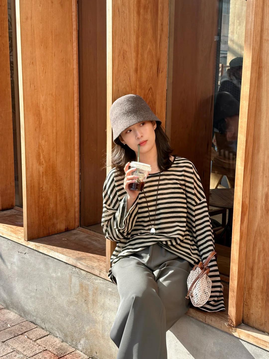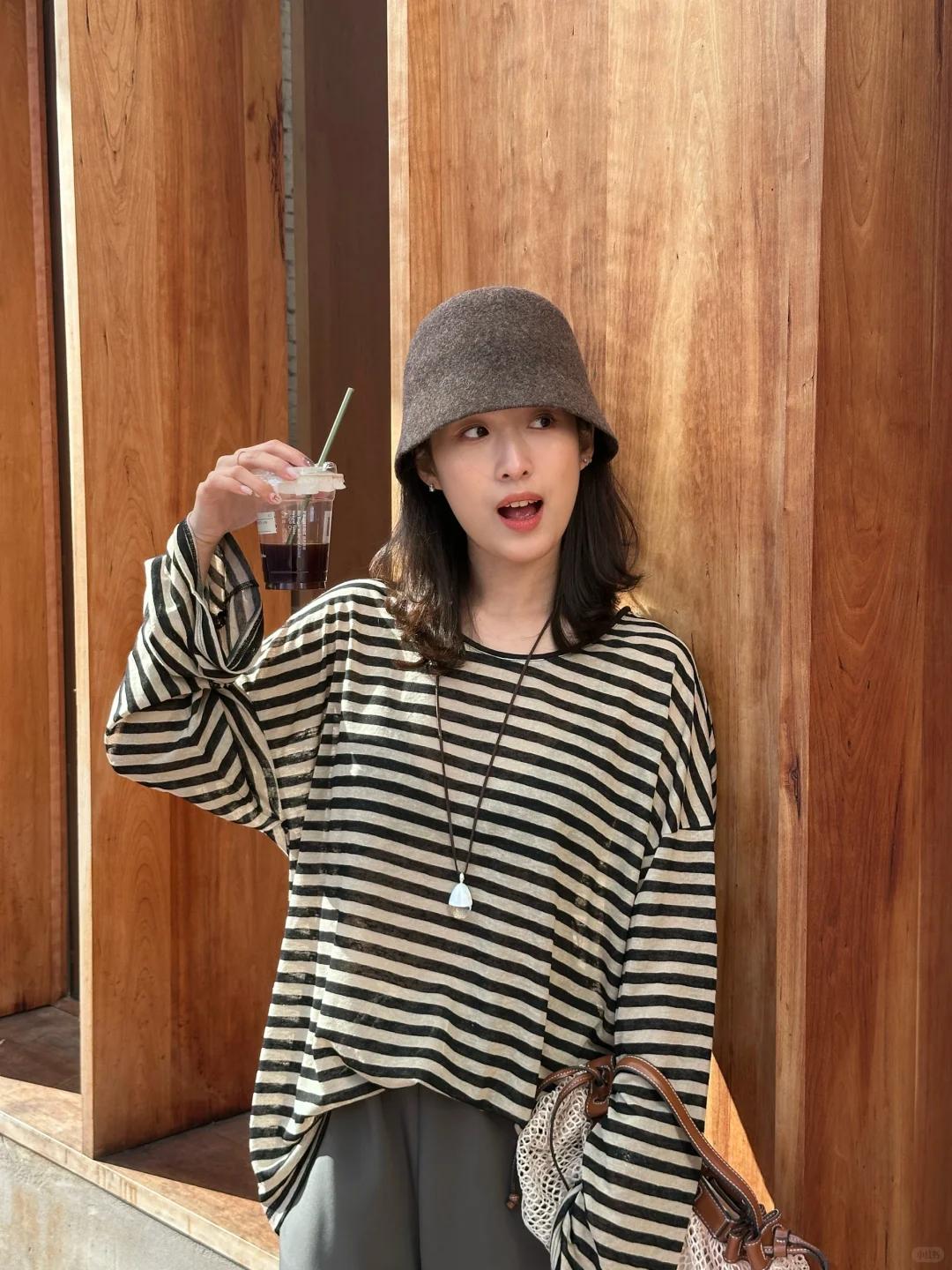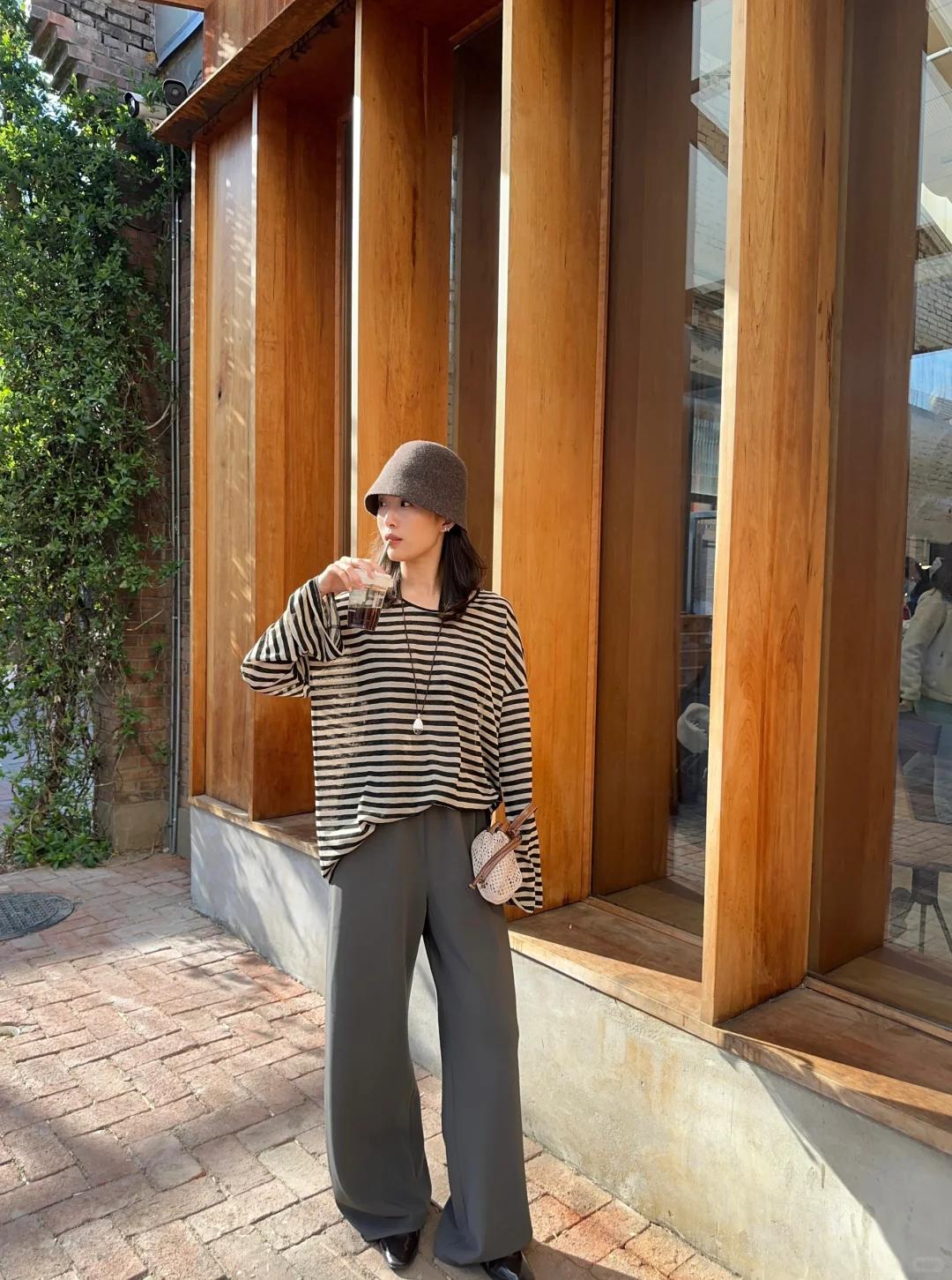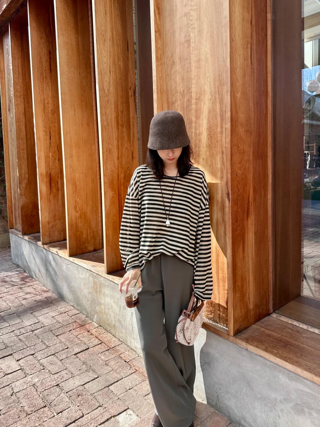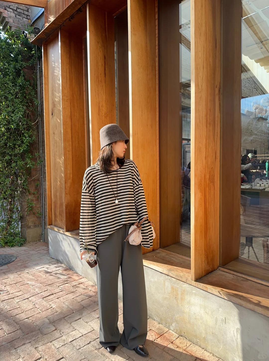 春日慵懒高级感|条纹衫穿搭天花板✨ 谁能拒绝一件复古又百搭的条纹衫啊!灰黑色条纹经典耐看,宽松版型对身材超包容,慵懒感直接拉满~ 搭配同色系灰色阔腿西裤,垂感绝佳还巨显腿长,同色系搭配温柔又高级,轻松穿出松弛氛围感。再戴上一顶灰色渔夫帽,整体造型完整度 UP,出门不用费心打理发型也超有范儿! 整套搭配慵懒舒适又不失格调,简约中透着精致感,春日出门散步、喝咖啡、通勤都超合适,气质感稳稳拿捏,百搭不出错的春日 look,闭眼冲就对了!ps:图片来源于博主S.Liii