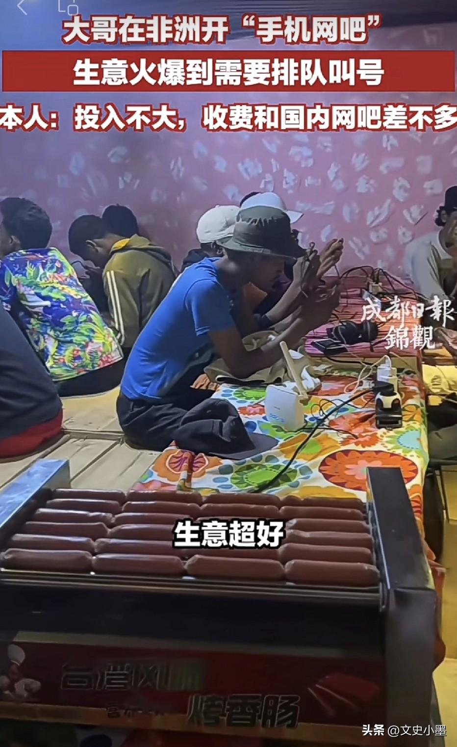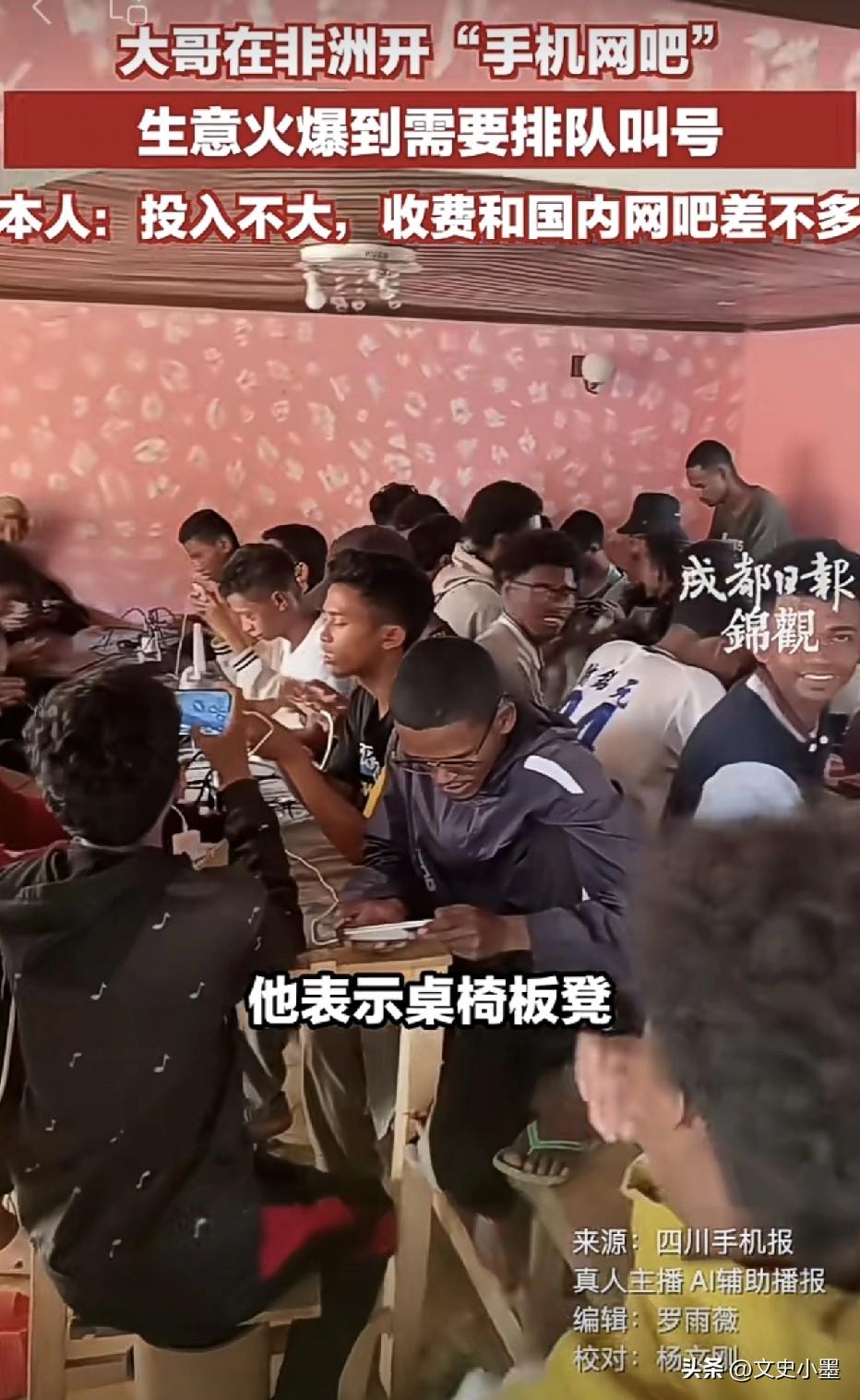 中国一男子在非洲发现了新商机,他发现马达加斯加手机普及率并不高,在那边智能手机相当于奢侈品,普通人根本买不起,他们对于用手机上网有强烈需求! 头脑灵活的他认为要是在这里开一家手机网吧,肯定生意不错!手机网吧顾名思义,是给客户提供手机用来上网的地方! 他租了一处场地,买了几十部智能手机,装上无线网络,自己又制作了一些桌椅板凳,简单一收拾便开张了,没想到生意好的不得了,当地很多人都来上网,来晚了还需要排队!另外,他还弄了个烤箱卖烤肠,很多人上网累了还可以买一根尝尝! 网吧收费标准跟国内差不多!如此火爆,这样运营一年的话,应该能赚不少吧!