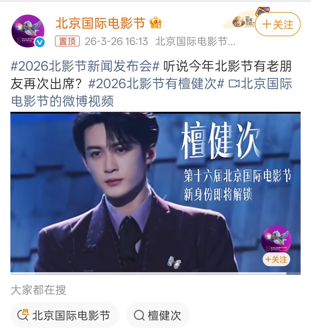 刚刚北京国际电影节官方微博特意置顶了檀健次确定参加第16届北京国际电影节的视频!翻看之前的记录,发现檀健次在2025年北影节表现真的特别亮眼! 整场开幕式,檀健次算是从头贯穿到尾的了(除了主持人),也是唯一一位既有作品,又有表演,又是评委的明星!我们来数一数檀健次那天一共出现了多少次? 1️⃣开幕式正式开始前,北京国际电影节邀请函视频播放前,一个单人的邀请大家来北京观影的视频,仅有他哦! 【大家好,我是檀健次,推开家门遇见另一个世界的自己,银幕里的故事正等待着和你交换春天的诗意】 2️⃣走红毯环节代表本届北京国际电影节短片单元 RF 新血计划终审评委和评委会主席陈建斌 ,崔睿、梁静、饶雪漫一同出席红毯! 谈及对好电影的感受:“带着观众的心态去看,能够打动观众的就是好电影”。 3️⃣作为电影《震耳欲聋》的主演和导演饶晓志,兰西雅、王砚辉一同出席! 4️⃣开幕式正式开始时,开场歌曲里,健次被写进了歌词里~ 5️⃣开幕式嘉宾表演环节,第一首嘉宾歌曲,献唱《在故事的最终》,一开口温暖磁性的声音,还有那一帧帧电影画面,听着心里软软的! 6️⃣开幕式全体评委亮相环节,以短片单元评委再次上台! 7️⃣开幕式推荐影片剧组环节,以电影《震耳欲聋》剧组领衔主演演员身份再一次又上台! 8️⃣开幕式接近尾声邀请环节,在《北京欢迎你》短片中,再次献唱,出现个人+合唱画面2次! 9️⃣开幕式结尾,推广曲环节,我和我~健次与小时候的多多又一起出现在荧幕上,这一幕真的太有感触了! 如果用一个词来形容北京电影节上檀健次,那就是“绽放”了、是属于演员檀健次的绽放、同时也是全能艺人檀健次的彻底绽放。 看到北京电影节组委会的徐滔说大家可以猜猜檀健次这次到底会以什么身份参加? 檀健次上午宣布TME平台sw代言官宣,下午又被官方cue到电影节有檀健次亮相,这个三月喜事连连啊!!