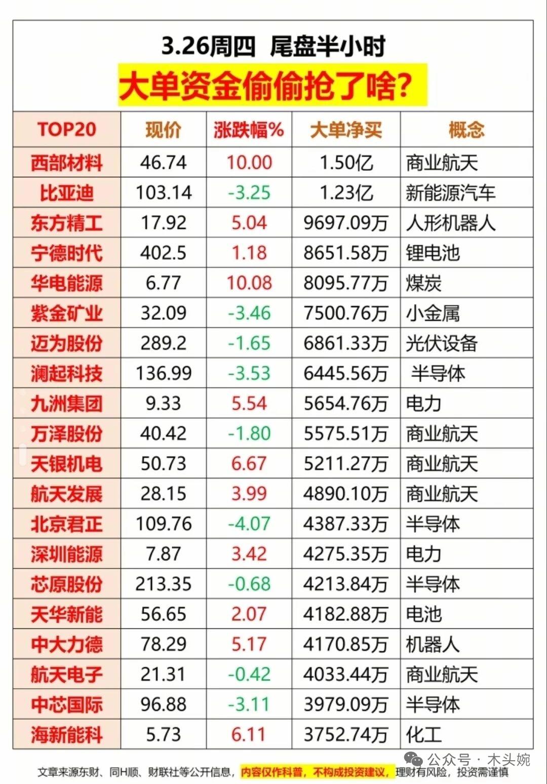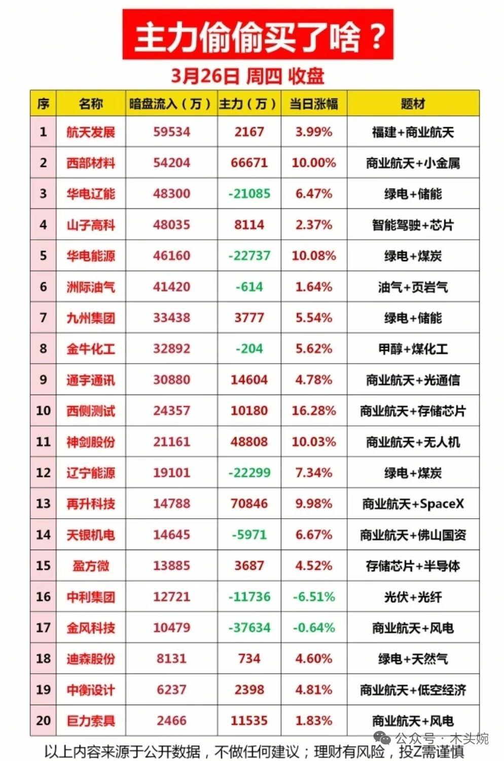 3月26日复盘|市场普跌下的资金暗线,商业航天成最强主线! 26日三大指数集体收跌,两市缩量至1.96万亿,超4400股飘绿,情绪偏冷。主力净流出924亿,电池、能源金属板块获逆势净流入,半导体、通信设备成资金出逃重灾区。 商业航天概念强势领涨,西部材料、再升科技等多股涨停,尾盘半小时大单资金仍在疯狂抢筹相关标的,成为市场唯一高热度方向。 ⚠️ 风险提示:市场整体偏弱,主线持续性待验证,操作上宜控仓观望,聚焦核心题材龙头。
