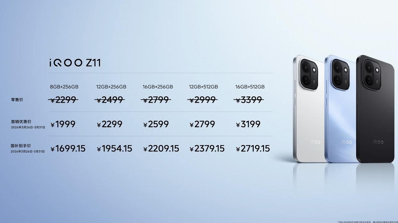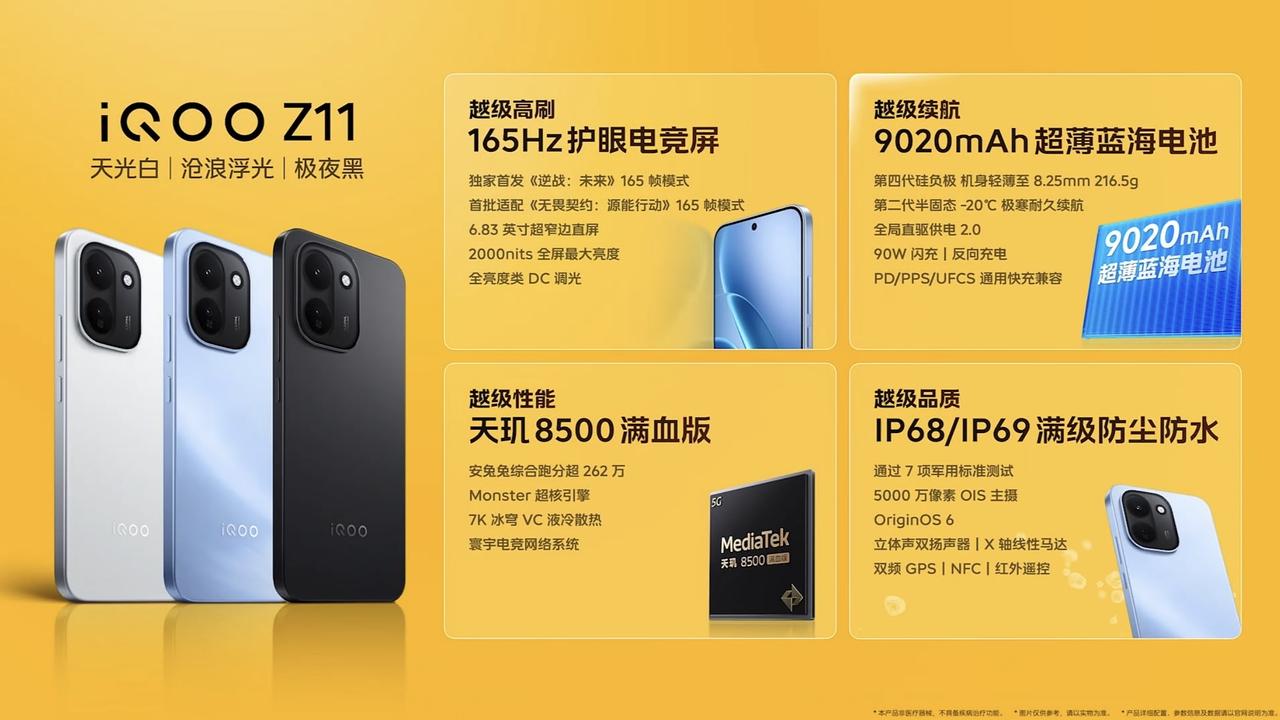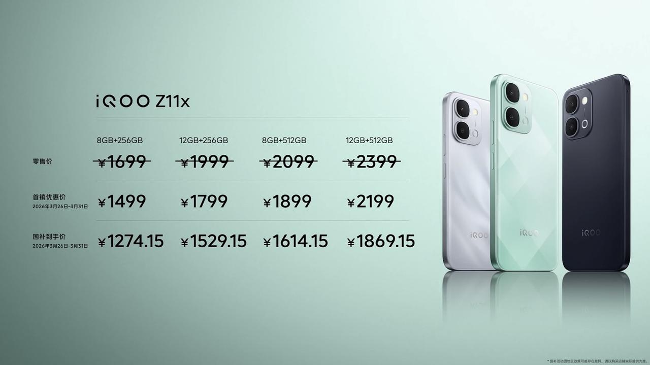 iQOO Z11和Z11x发布,iQOO手机更高的屏幕刷新率和更大电池容量安排上了。内存大涨价的大环境下,两款新机的价格也比往年的千元机贵不少,但iQOO咬牙为消费者准备了首销优惠。 iQOO Z11: 6.83英寸1.5K直屏,165Hz超高刷 天玑8500满血版,跑分262.5万 7K冰穹散热,Monster超核引擎 9020毫安时大电池,90W快充 满级防水,通过7项军标测试 5000万像素大底OIS主摄,签到水印功能 8GB+256GB:1999 12GB+256GB:2299 16GB+256GB:2599 12GB+512GB:2799 16GB+512GB: 3199 iQOO Z11x: 6.76英寸 0频闪LCD屏,1200尼特分峰值亮度 天玑7400处理器,跑分105万,UFS 3.1闪存 7200毫安时电池,红外遥控,全功能NFC OriginOS 6系统,满级防尘防水 8GB+256GB:1499 12GB+256GB:1799 8GB+512GB:1899 12GB+512GB:2199