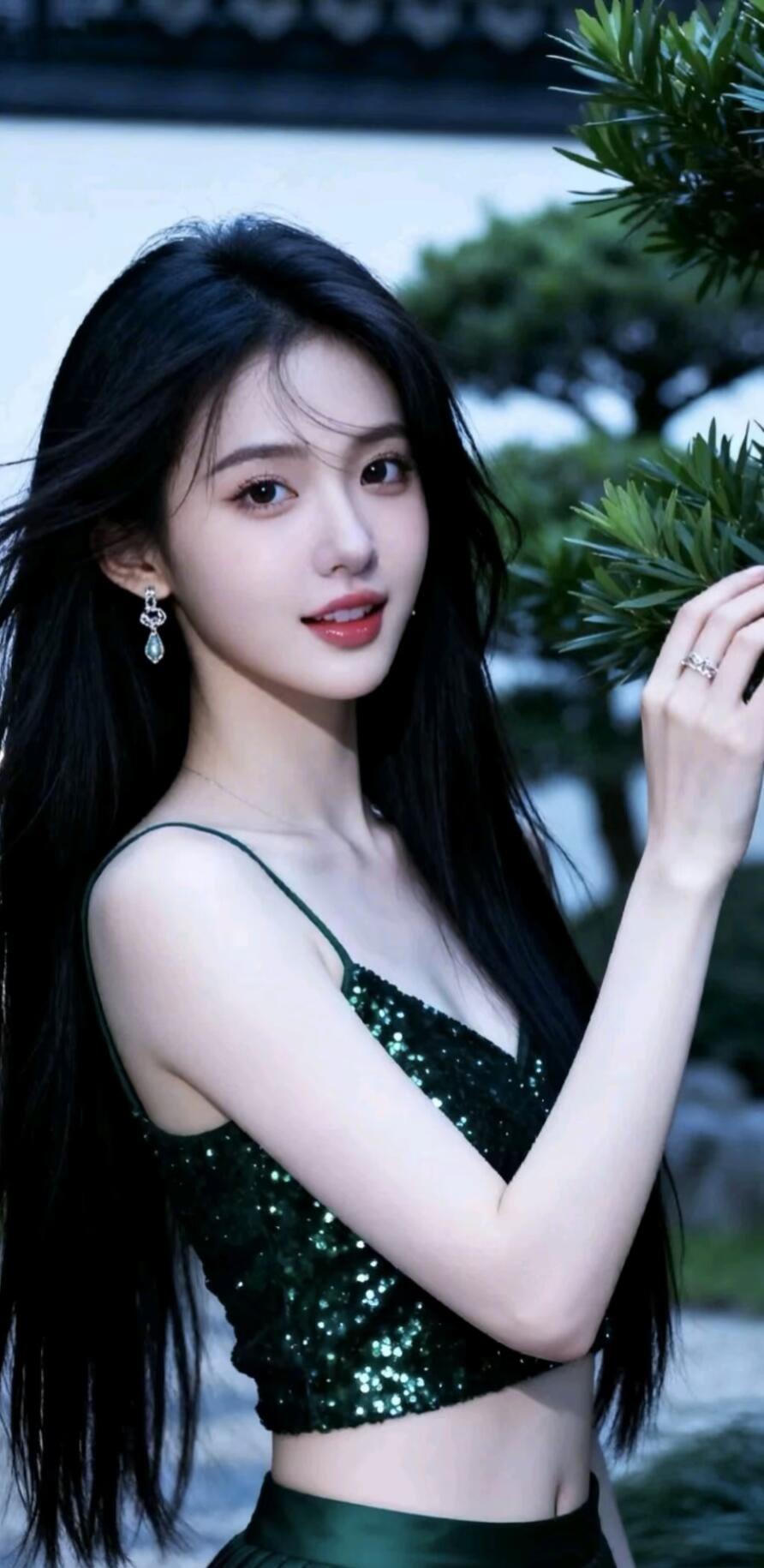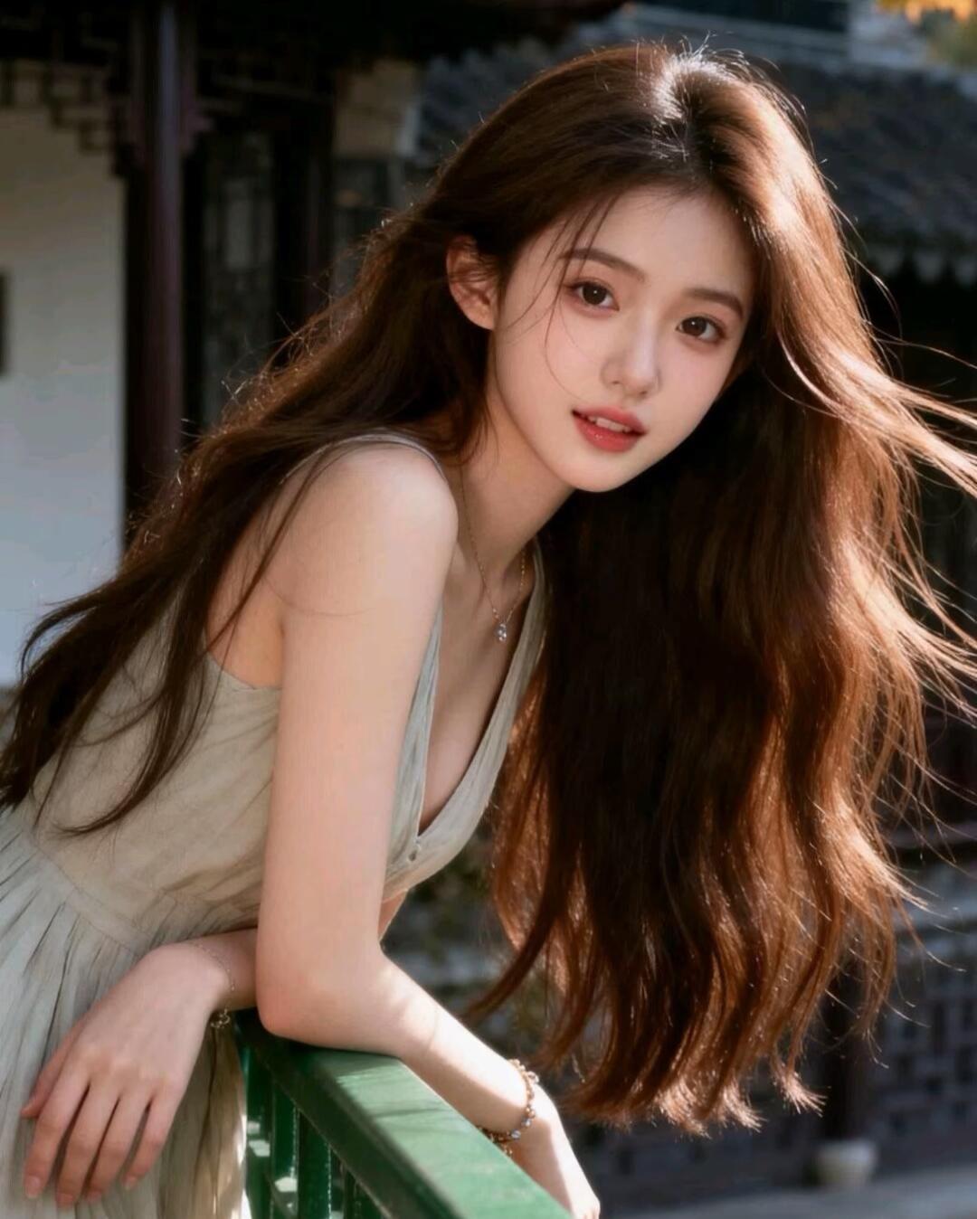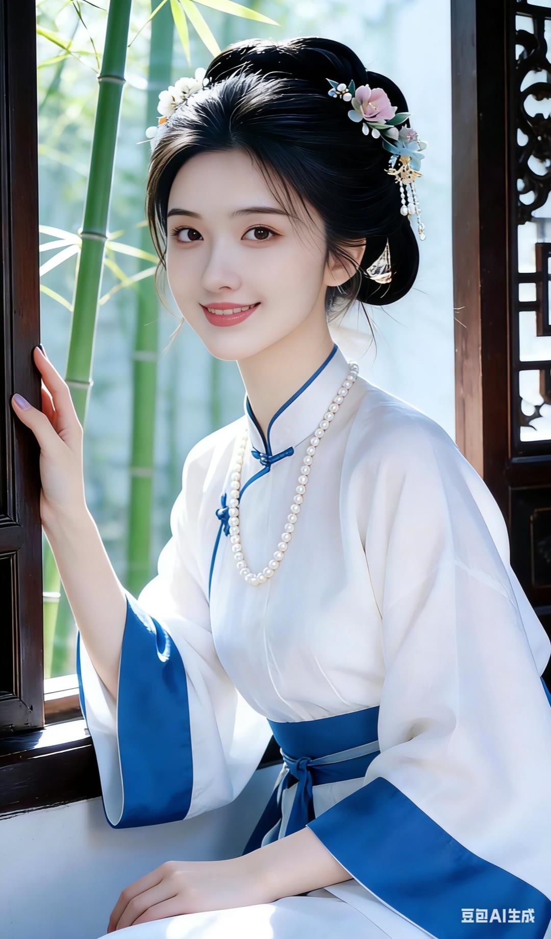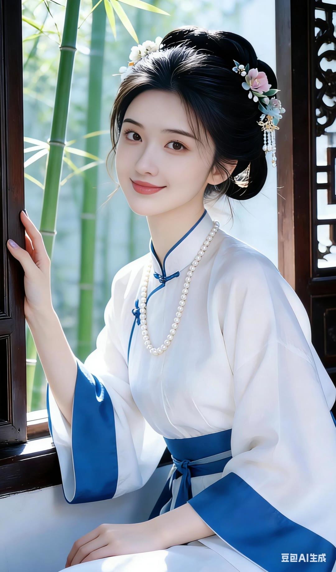 古风少女倚窗笑,竹影婆娑映窗纱。