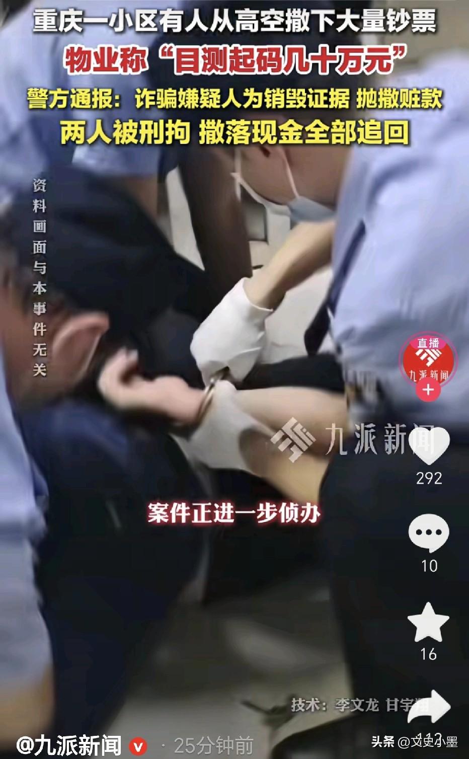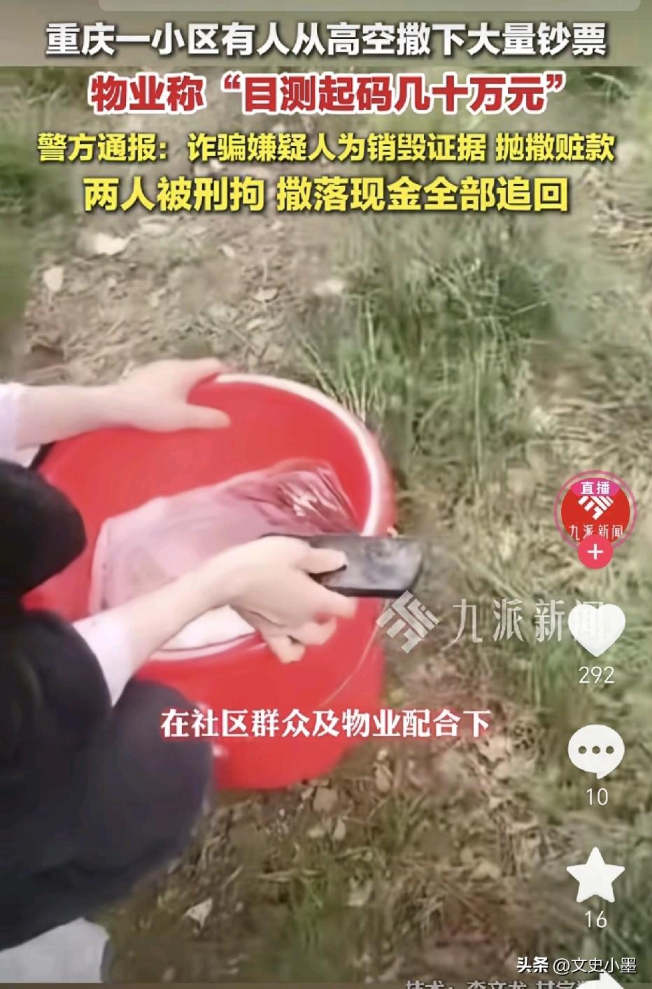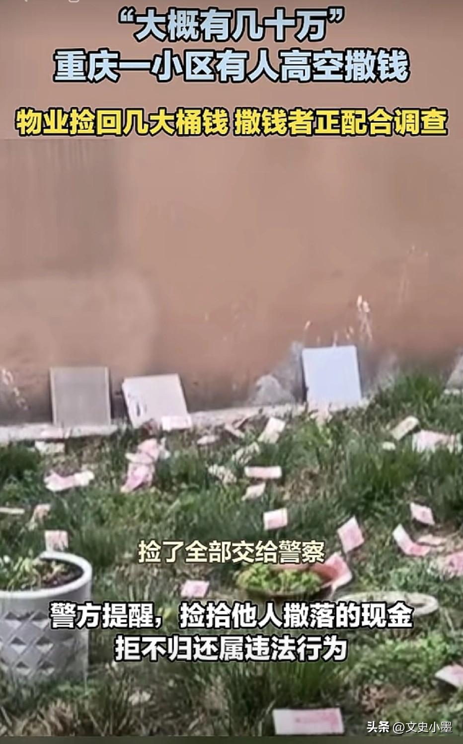 近日,重庆某小区内,一女子大喊:大家可以帮忙捡钱啊!只见数不清的红色百元大钞从天而降,纷纷扬扬落在了楼下草坪上,很多人觉得不可思议,天上虽然没掉馅饼,却掉下来了现金,大家都去捡拾! 物业公司发现后,觉得这些钱可能来路不明,于是便安排工作人员去捡钱,没一会,他们就捡了好几桶,全是百元大钞,估计得有几十万吧! 原来,当天下午,当地警方正在该小区33楼抓捕涉嫌诈骗的两名人员,这俩人为销毁证据,仓皇失措的把一摞摞百元纸币从33楼窗户往下抛洒!这才有了开头那一幕! 最后,物业公司和热心群众把捡到的钱全都上交给了当地警方,目测有几十万之多吧! 看来这两人是真的慌了,要不然也不会把这一钱全部扔掉,以为这样就拿他们没有办法了。他们没有想到,在小区物业和业主的共同努力下,抛洒出去的钱又被找回来了,闹这一出,纯属白费心机! 有人说:自己怎么没碰上这种捡钱的好事,真要碰上捡到了也是麻烦,毕竟这些钱来路不明,花着不踏实,早晚都可能被追回!并且也有规定,捡拾他人撒落的现金拒不归还属违法行为。所以,不要捡了芝麻丢了西瓜,让自己摊上事!