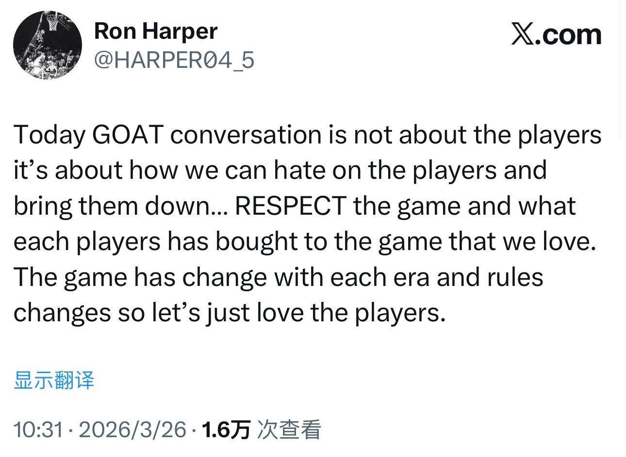 “如今关于“史上最佳球员”的讨论,早已偏离了球员本身,演变成了对球员的恶意诋毁与贬低。请尊重这项运动,以及每一位为我们所热爱的篮球事业做出贡献的球员。随着时代变迁,篮球运动与规则不断发展革新,让我们用真心对待每一位球员。”