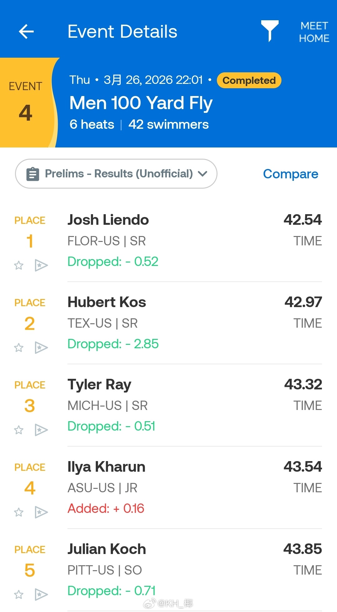 NCAA DI Men's Championships 男100码蝶泳预赛,Josh Liendo 42.54刷新奇葩保持八年之久的NCAA和全美公开纪录!