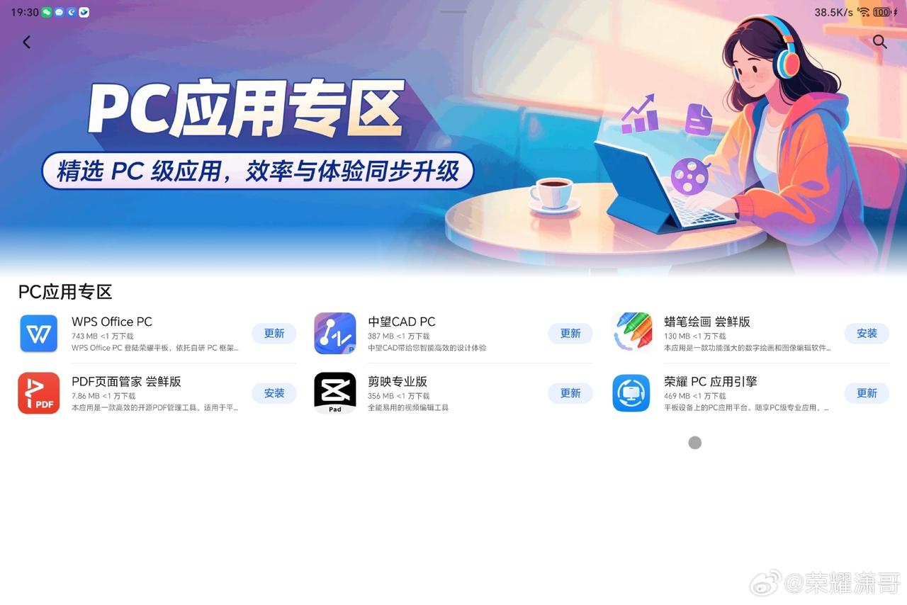 果然在平板PC化的道路上,荣耀也是蛮认真的,并不是随便说说,依托荣耀平板强悍的性能,让小伙伴们在平板上也能够实现PC熟悉的工作方式,刚刚看到荣耀全场景产品线负责人潇哥透露,荣耀平板应用市场的PC应用专区,每月都会更新精选优质生产力软件,大家说给不给力?畅聊数码新品 数码资讯