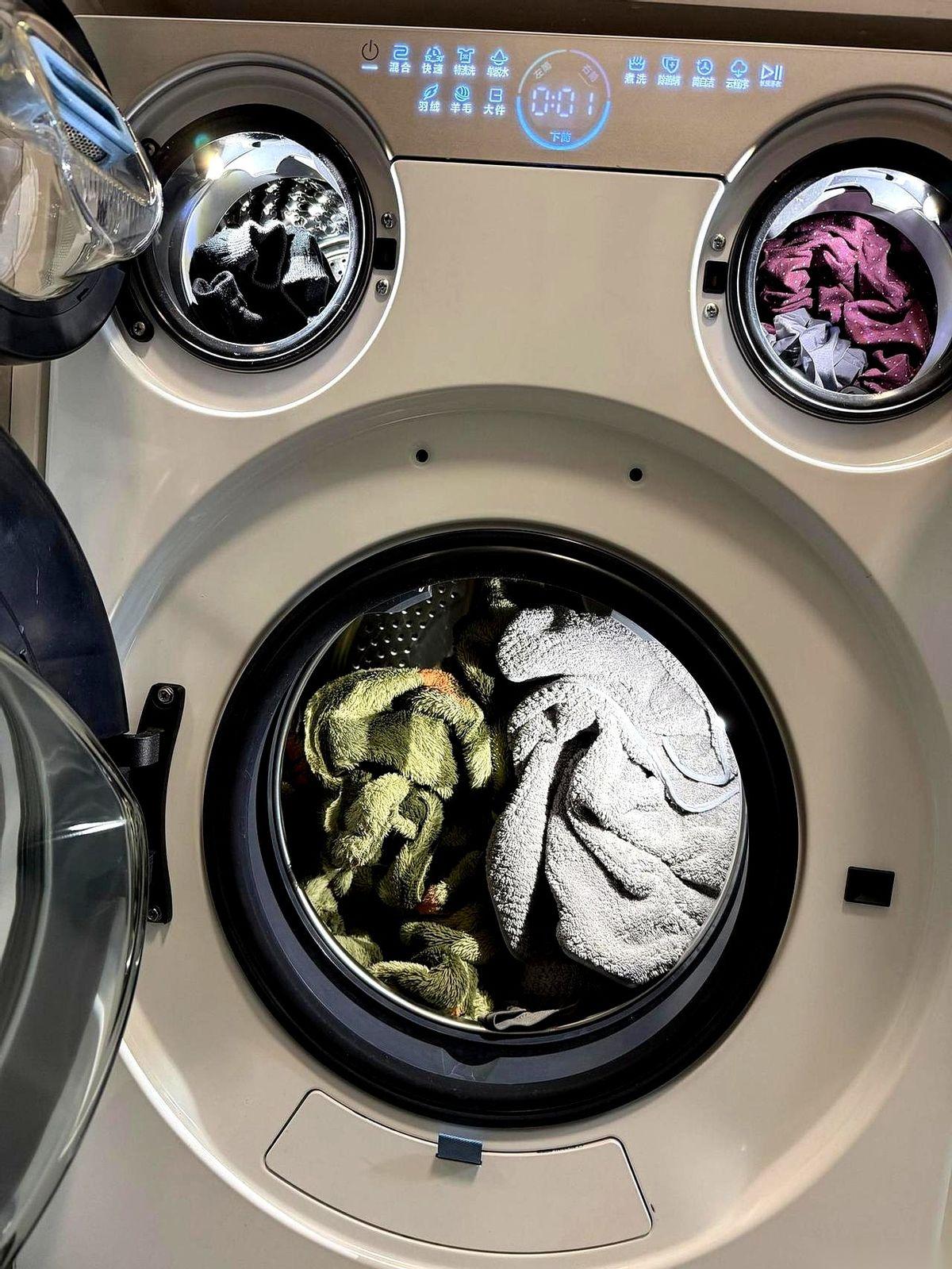 美的在新洗衣机里,塞了根东西,直接冲着袜子里的脚气真菌去的。 号称能干掉99.99%的红色毛藓菌,洗完之后,还能管七天。 意思就是,你出门在外,当着别人的面脱鞋,脚上闻不到那股尴尬味儿。 以前的洗衣机,就是个大铁桶。一家人的衣服,外套上的灰、贴身穿的汗、还有那双运动鞋里刚扒下来的袜子,全都倒进去一锅烩。搅完拿出来,心里总犯嘀咕。 现在它直接给你釜底抽薪。 机身上开了三个门。上面两个并排的小筒,一个丢内衣,一个塞袜子。下面那个10公斤的大筒,专门伺候你的外套、床单、牛仔裤。 “砰”“砰”“砰”三扇门一关,彻底物理隔离,谁也别想串味儿。 那根叫“小蓝棒”的玩意儿,就装在专门洗袜子的那个小筒里,任务只有一个,就是死磕真菌。 这还没完。 碰上那种衣服晾一个礼拜都干不了的回南天,潮得发沉的被子直接扔进去,热泵柔烘,抱出来的时候又干又蓬松,像刚晒过太阳。 洗完的衬衫,拿出来几乎没褶子,省了挂烫机的功夫。它自己会感知湿度,衣服干了就停,不会傻乎乎地一直烤,把好好的衣服烤坏。 以前总觉得,洗衣机不就是把脏衣服变干净么。 现在才发现,它解决的根本不是脏不脏的问题,是你把内衣和袜子分开那一刻的讲究,是你回家脱鞋那一瞬间的体面。