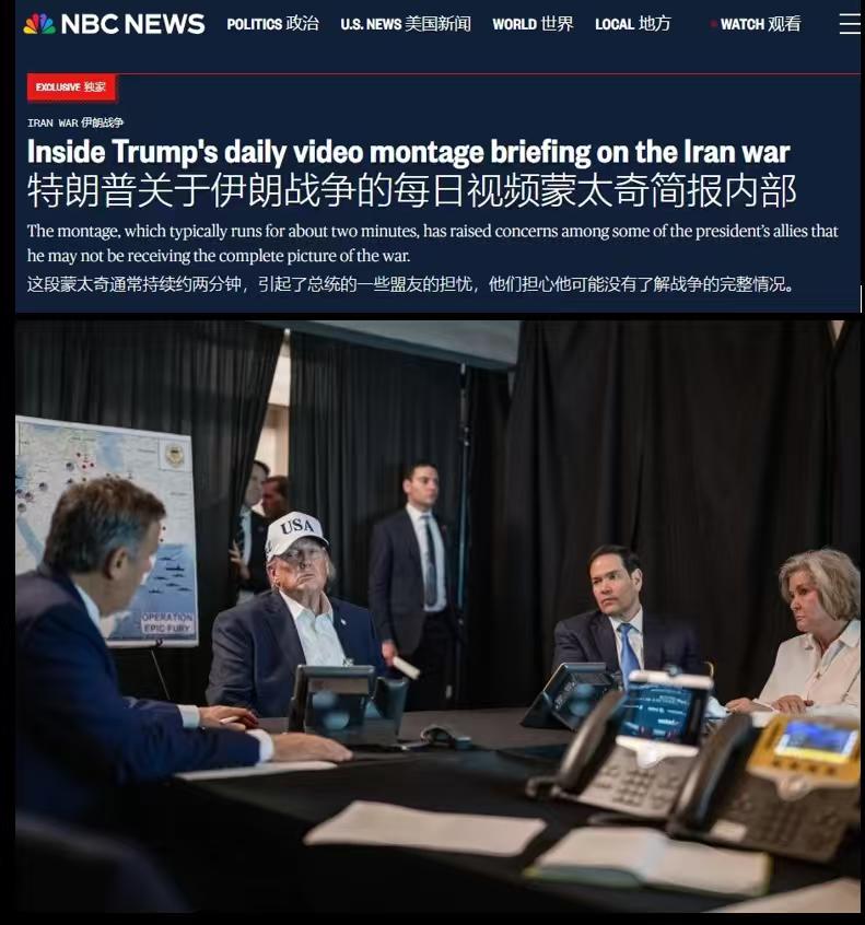 怪不得特朗普天天说美国赢麻了,原来他得到的情报就是如此!作为美国总统,他居然不清楚中东的真实情况。到底是什么人在骗他? 25日,美国国家广播公司援引多名白宫官员的话称,特朗普获取中东战况信息的方式,仅限于观看军方精心剪辑的短视频、新闻报道,或者听手下官员报告。 从上述信息,我们不难看出,特朗普看到的关于中东的情报,都是美军想给他看的。那些信息和视频,都已经经过了精心的剪辑,应该是报喜不报忧的那种!最终呈现的结果就是,特朗普活在美军编制的胜利“神话”中。而外界的我们,则是看到了真相。 在特朗普看来,他说的全是真话,但在我们的眼里,他在撒谎。仔细想想,特朗普也是可怜的很!火灾了没变编制的信息蚕茧中,不知不觉间,成了全世界的笑话!