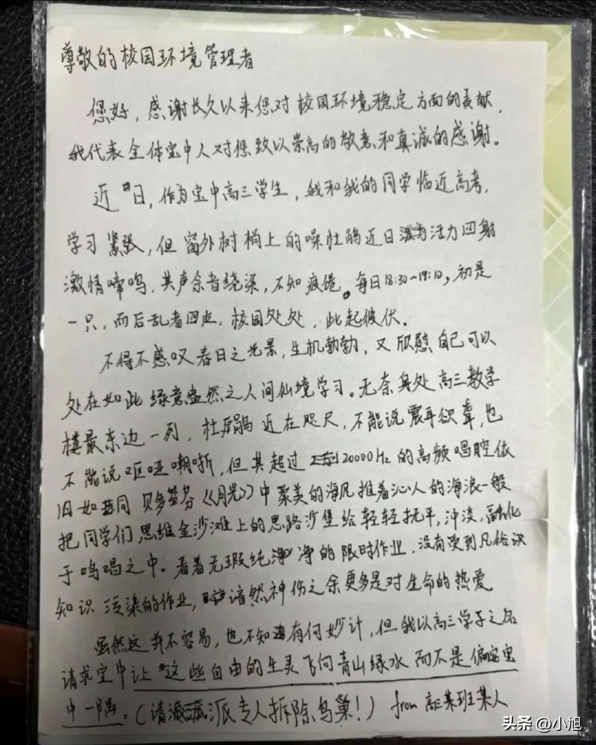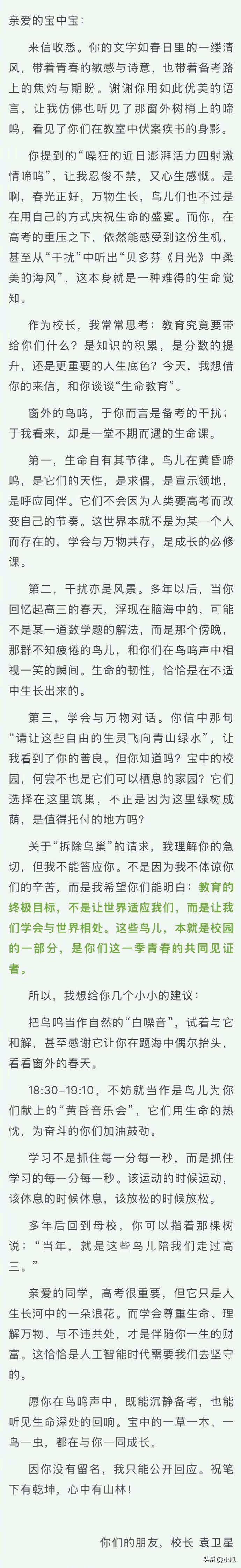 深圳宝安中学,一个高三学生写了封信,直接塞进了校长信箱。 信里写的是鸟,噪鹃,最近正是求偶期。每天傍晚六点半到七点十分,先是单曲循环,然后四面八方都跟着应和,此起彼伏。 这孩子在信里写了一段话,挺有意思。他说那些鸟叫声不算刺耳,但那种高频穿透力,就像《月光奏鸣曲》里轻柔的海风,一遍一遍地把他好不容易在“思维沙滩”上搭起来的思路沙堡,给抚平了、冲淡了、融化了。 翻译成大白话就是:做题做到关键处,鸟一叫,思路断了。 他的诉求很简单——把鸟巢拆了,让这些鸟回青山绿水去,还高三一个清净。 校长袁卫星收到这封信了。 信没署名,但校长决定公开回复。回信第一句话,先夸这孩子文字写得好。说你在高考压力下还能从鸟叫声里听出贝多芬,是“难得的生命觉知”。 然后话锋一转。 拆鸟巢这事,校长说他不能答应。 不是不体谅高三学生的辛苦。他在信里写得很清楚:这个世界不是为某一个人转的。那些鸟在黄昏叫,是求偶,是呼应同伴,是它们的天性。它们不会因为人类要高考就改时间。 接着他写了一句被很多人转发的话:教育的终极目标,不是让世界适应我们,而是让我们学会与世界相处。这些鸟儿,本就是校园的一部分,是你们这一季青春的共同见证者。 校长还给支了个招。说傍晚六点半到七点十分那个时段,就当是鸟儿给高三献上的黄昏音乐会,用生命的热忱给你们加油鼓劲。 这封信的最后一段,我反复看了好几遍。 校长说,高考很重要,但它只是人生长河里的一朵浪花。而学会尊重生命、理解万物、跟不适共处,才是能跟你一辈子的财富。这恰恰是人工智能时代需要我们去坚守的。 整件事有意思的地方,其实不是这封信本身。 而是这个校长做了一个选择。那个选择背后,站着整座城市的态度。 深圳湾公园,前段时间也出了件事。有市民嫌公园晚上太暗,要求加装路灯。还有市民想投喂海鸥,要求取消广播禁令。 公园管理处的回复,让很多人没想到。 不加路灯,是因为高亮度照明会破坏深圳湾的生态平衡,干扰候鸟越冬栖息和迁飞节律。不让投喂,是因为人类食物会导致候鸟营养不良,甚至让它们丧失野外觅食的能力。 两个回复,理由都是同一个——这些地方,不只是人的。 深圳这座城市,对鸟的态度,好像一直是这样。 滨海大道修路的时候,为了不打扰候鸟,整条路往北迁了两百多米,把滩涂还给了候鸟和鱼虾。 腾讯大厦的玻璃幕墙,贴了防鸟撞的波点贴纸,让鸟儿能“看见”玻璃。 福田红树林生态公园,给鸟装了一百盏“鸟巢路灯”,灯杆上设置巢箱,现在成了鹊鸲和大山雀的热门房源。监控画面里,鸟儿们排队往里钻。 甚至去年刚通车的鲲鹏径一号桥,桥上90%的面积是给野生动植物用的,人行步道只占了10%。桥建好才23天,红外摄像头就拍到国家二级保护动物野生豹猫过桥。 你看,一座城市修路、装灯、盖楼,都得先问问鸟同不同意。 所以宝安中学这个校长,不答应拆鸟巢,其实不是他一个人的决定。 是整座城市的共识。 那个写信的高三孩子,可能现在还坐在教室里,一边刷题一边听鸟叫。 他可能还是会烦躁,还是会走神。 但很多年以后,他考上大学,工作,成家。有一天突然想起来,高三那年春天,有一群噪鹃在窗外叫得震天响,校长给他回了封信,说那叫黄昏音乐会。 他可能会笑。 觉得那个傍晚,也没那么烦。 你觉得这个校长做得对吗?要是你孩子在高三,被鸟叫吵得学不进去,你会支持他写信去拆鸟巢吗? 信息来源: 本文综合自南方教育时报、深圳教育、读特客户端、新华社、中国环境报等媒体报道